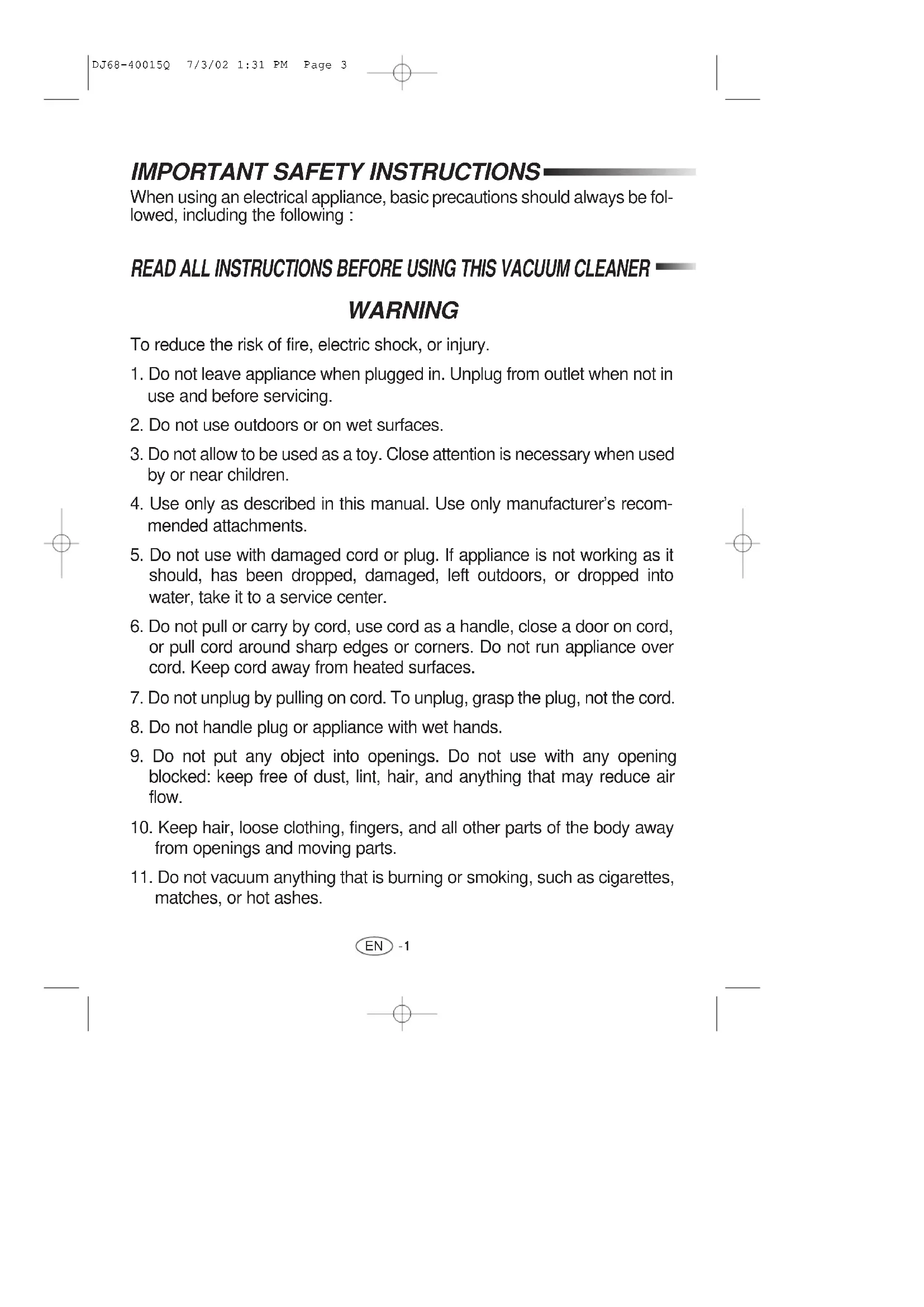 READ ALL INSTRUCTIONS BEFORE USING THIS VACUUM CLEANER When using an electrical appliance, basic precautions should always be fol- lowed, including the following : WARNING To reduce the risk of fire, electric shock, or injury.