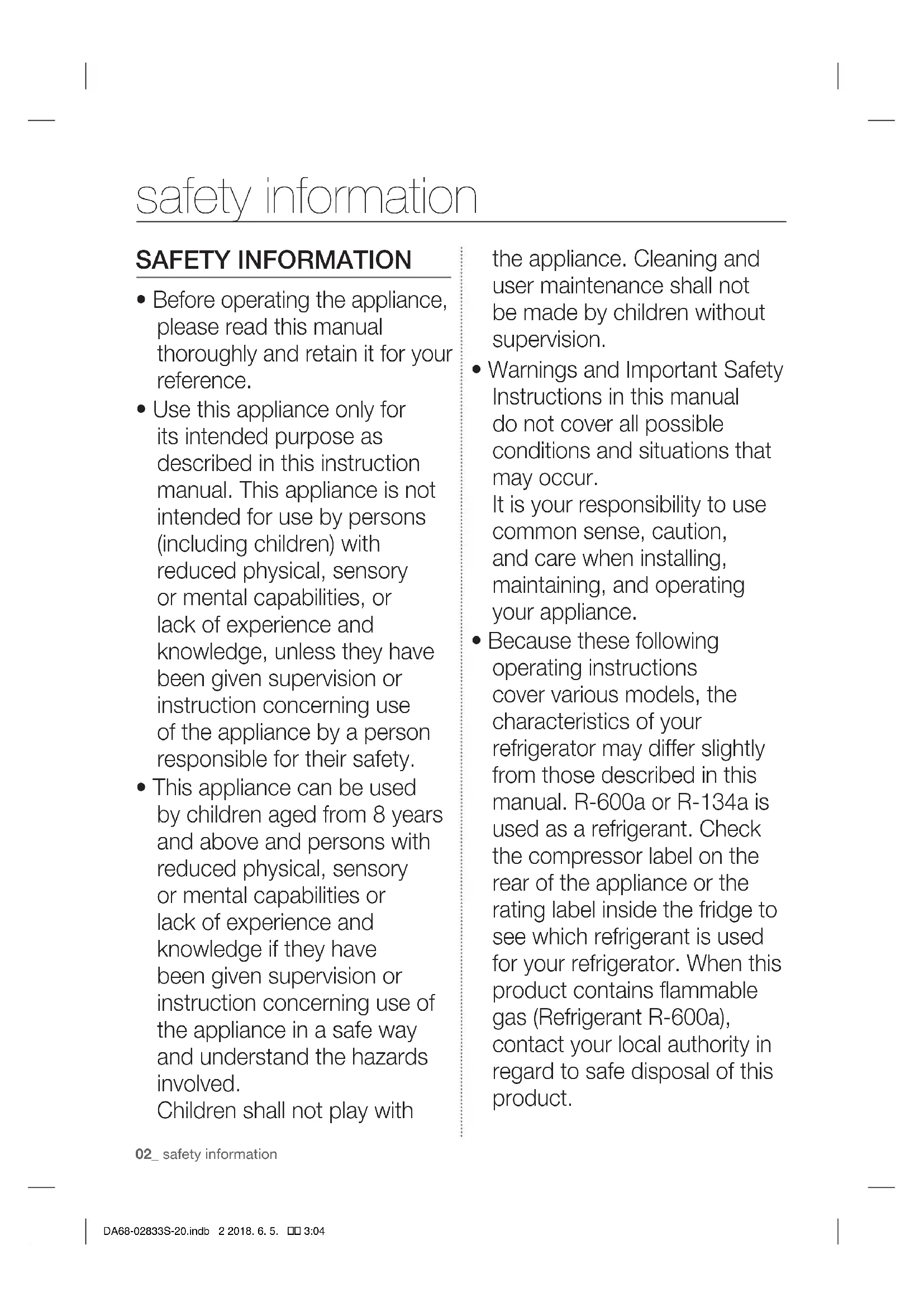 - Because these following operating instructions cover various models, the characteristics of your refrigerator may differ slightly from those described in this manual. R-600a or R-134a is used as a refrigerant. Check the compressor label on the rear of the appliance or the rating label inside the fridge to see which refrigerant is used for your refrigerator. When this product contains flammable gas (Refrigerant R-600a), contact your local authority in regard to safe disposal of this product. safety information DA68-02833S-20.indb 2 2018. 6. 5. 3:04safety information _03