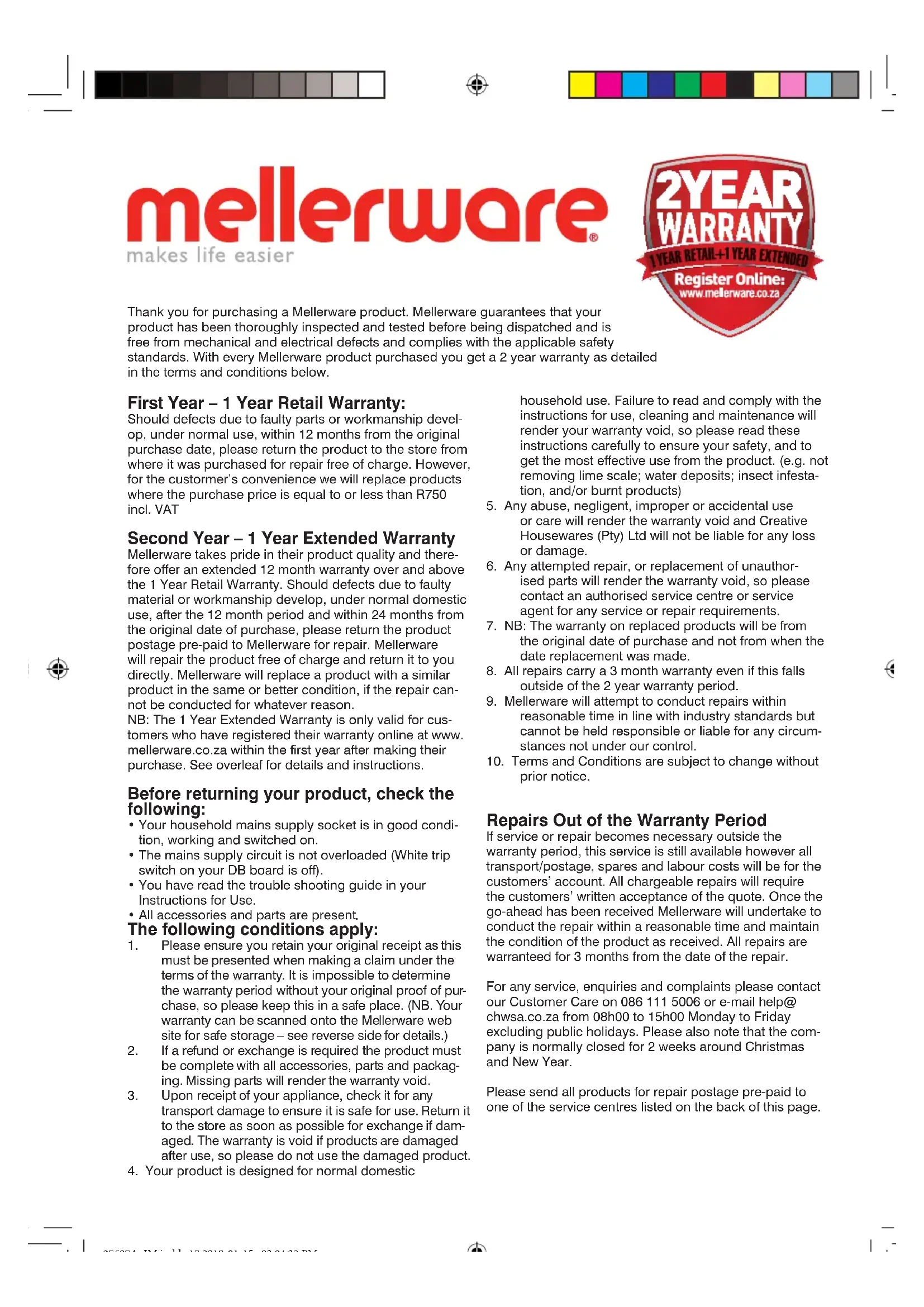en prop vervang wordThank you for purchasing a Mellerware product. Mellerware guarantees that your product has been thoroughly inspected and tested before being dispatched and is free from mechanical and electrical defects and complies with the applicable safety standards. With every Mellerware product purchased you get a 2 year warranty as detailed in the terms and conditions below. First Year – 1 Year Retail Warranty: Should defects due to faulty parts or workmanship devel- op, under normal use, within 12 months from the original purchase date, please return the product to the store from where it was purchased for repair free of charge. However, for the custormer’s convenience we will replace products where the purchase price is equal to or less than R750 incl. VAT Second Year – 1 Year Extended Warranty Mellerware takes pride in their product quality and there- fore offer an extended 12 month warranty over and above the 1 Year Retail Warranty. Should defects due to faulty material or workmanship develop, under normal domestic use, after the 12 month period and within 24 months from the original date of purchase, please return the product postage pre-paid to Mellerware for repair. Mellerware will repair the product free of charge and return it to you directly. Mellerware will replace a product with a similar product in the same or better condition, if the repair can- not be conducted for whatever reason. NB: The 1 Year Extended Warranty is only valid for cus- tomers who have registered their warranty online at www. mellerware.co.za within the first year after making their purchase. See overleaf for details and instructions. Before returning your product, check the following: