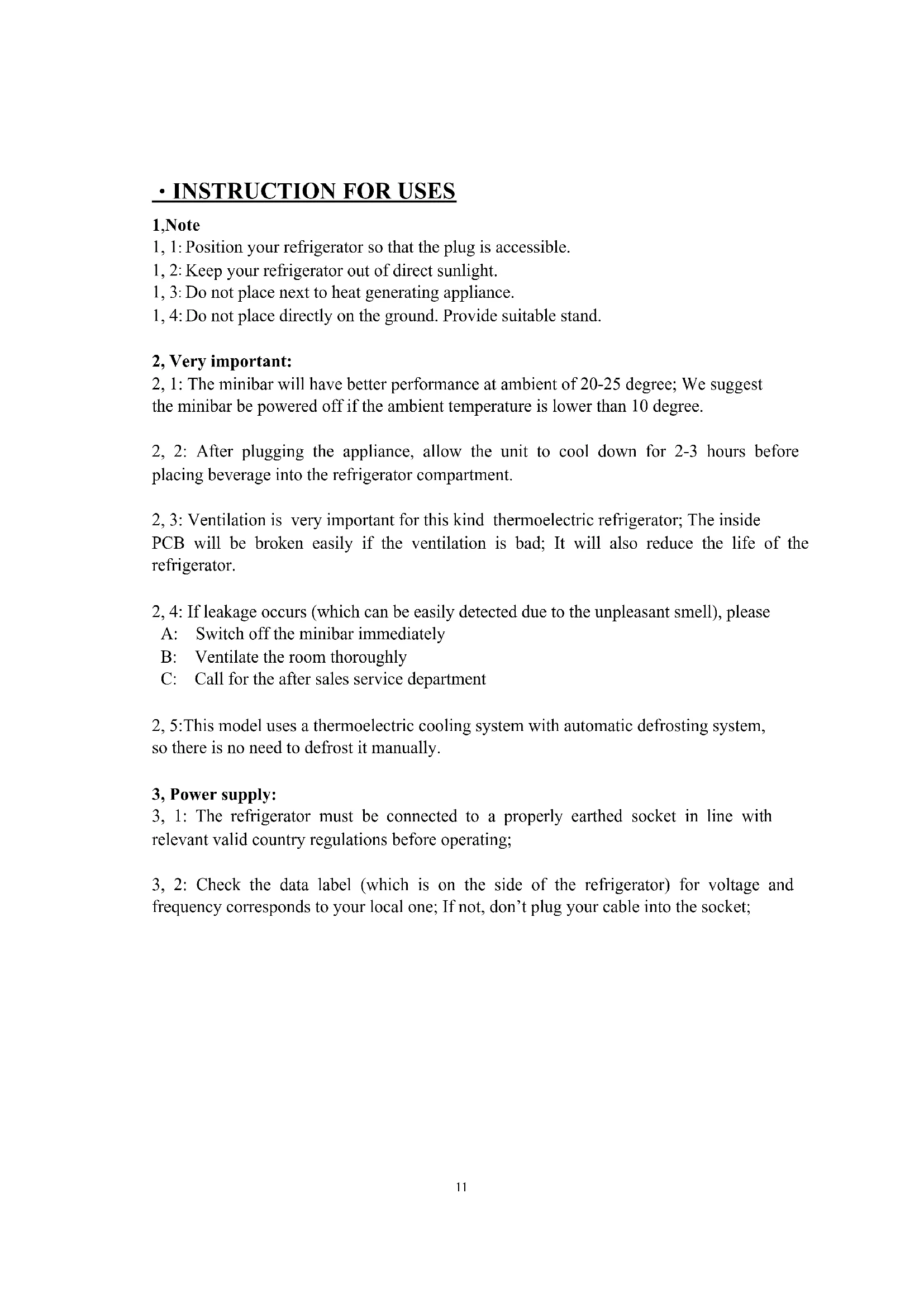 Do not place next to heat generating appliance. 1, 4: Do not place directly on the ground. Provide suitable stand. 2, Very important: 2, 1: The minibar will have better performance at ambient of 20-25 degree; We suggest the minibar be powered off if the ambient temperature is lower than 10 degree. 2, 2: After plugging the appliance, allow the unit to cool down for 2-3 hours before placing beverage into the refrigerator compartment. 2, 3: Ventilation is very important for this kind thermoelectric refrigerator; The inside PCB will be broken easily if the ventilation is bad; It will also reduce the life of the refrigerator. 2, 4: If leakage occurs (which can be easily detected due to the unpleasant smell), please A: Switch off the minibar immediately B: Ventilate the room thoroughly C: Call for the after sales service department 2, 5:This model uses a thermoelectric cooling system with automatic defrosting system, so there is no need to defrost it manually. 3, Power supply: 3, 1: The refrigerator must be connected to a properly earthed socket in line with relevant valid country regulations before operating; 3, 2: Check the data label (which is on the side of the refrigerator) for voltage and frequency corresponds to your local one; If not, don’t plug your cable into the socket;12