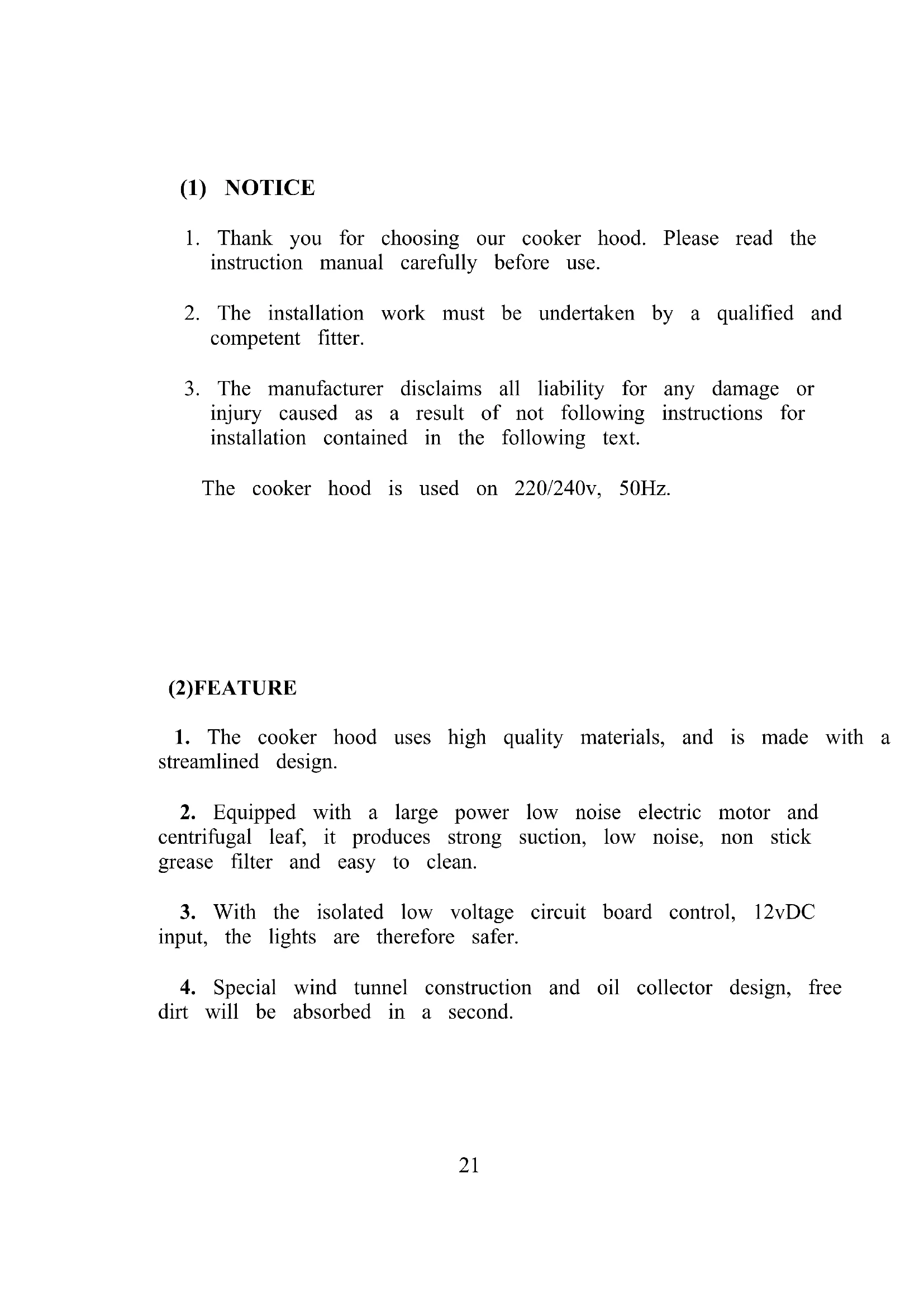 injury caused as a result of not following instructions for installation contained in the following text. The cooker hood is used on 220/240v, 50Hz. (2)FEATURE