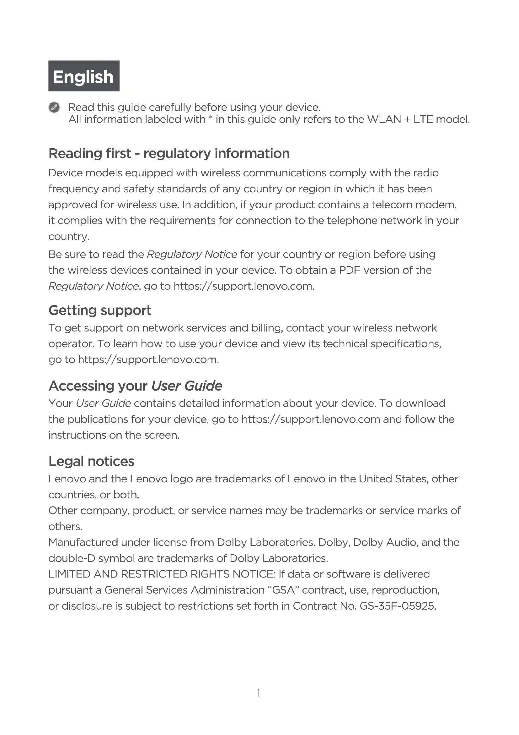 Reading first - regulatory information Device models equipped with wireless communications comply with the radio frequency and safety standards of any country or region in which it has been approved for wireless use. In addition, if your product contains a telecom modem, it complies with the requirements for connection to the telephone network in your country. Be sure to read the Regulatory Notice for your country or region before using the wireless devices contained in your device. To obtain a PDF version of the Regulatory Notice, go to https://support.lenovo.com. Getting support To get support on network services and billing, contact your wireless network operator. To learn how to use your device and view its technical specifications, go to https://support.lenovo.com. Accessing your User Guide Your User Guide contains detailed information about your device. To download the publications for your device, go to https://support.lenovo.com and follow the instructions on the screen. Legal notices Lenovo and the Lenovo logo are trademarks of Lenovo in the United States, other countries, or both. Other company, product, or service names may be trademarks or service marks of others. Manufactured under license from Dolby Laboratories. Dolby, Dolby Audio, and the double-D symbol are trademarks of Dolby Laboratories. LIMITED AND RESTRICTED RIGHTS NOTICE: If data or software is delivered pursuant a General Services Administration “GSA” contract, use, reproduction, or disclosure is subject to restrictions set forth in Contract No. GS-35F-05925. English2 Device overview Model Version Lenovo TB-8505F WLAN Lenovo TB-8505X WLAN + LTE