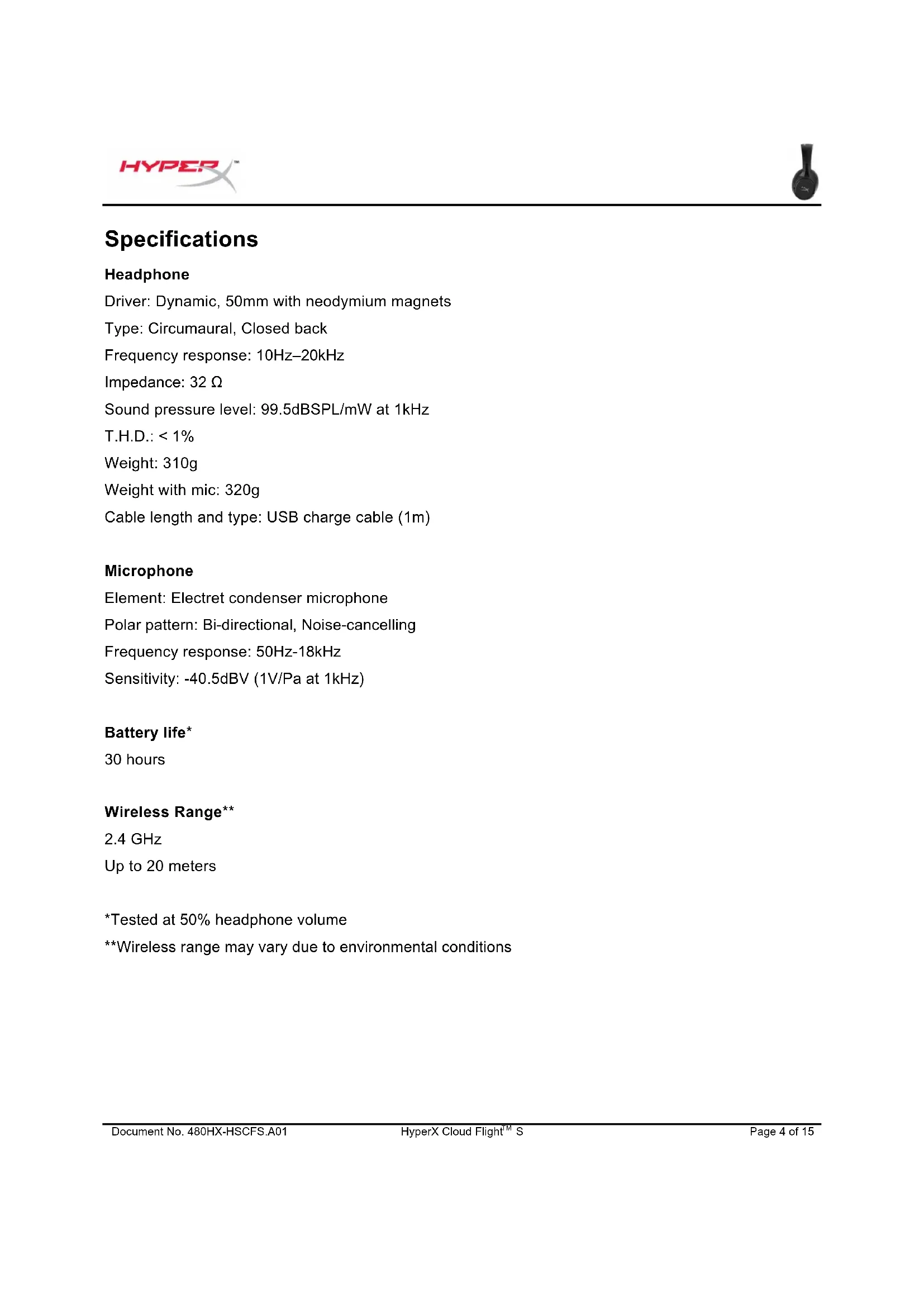 Up to 20 meters *Tested at 50% headphone volume **Wireless range may vary due to environmental conditionsDocument No. 480HX-HSCFS.A01 HyperX Cloud Flight