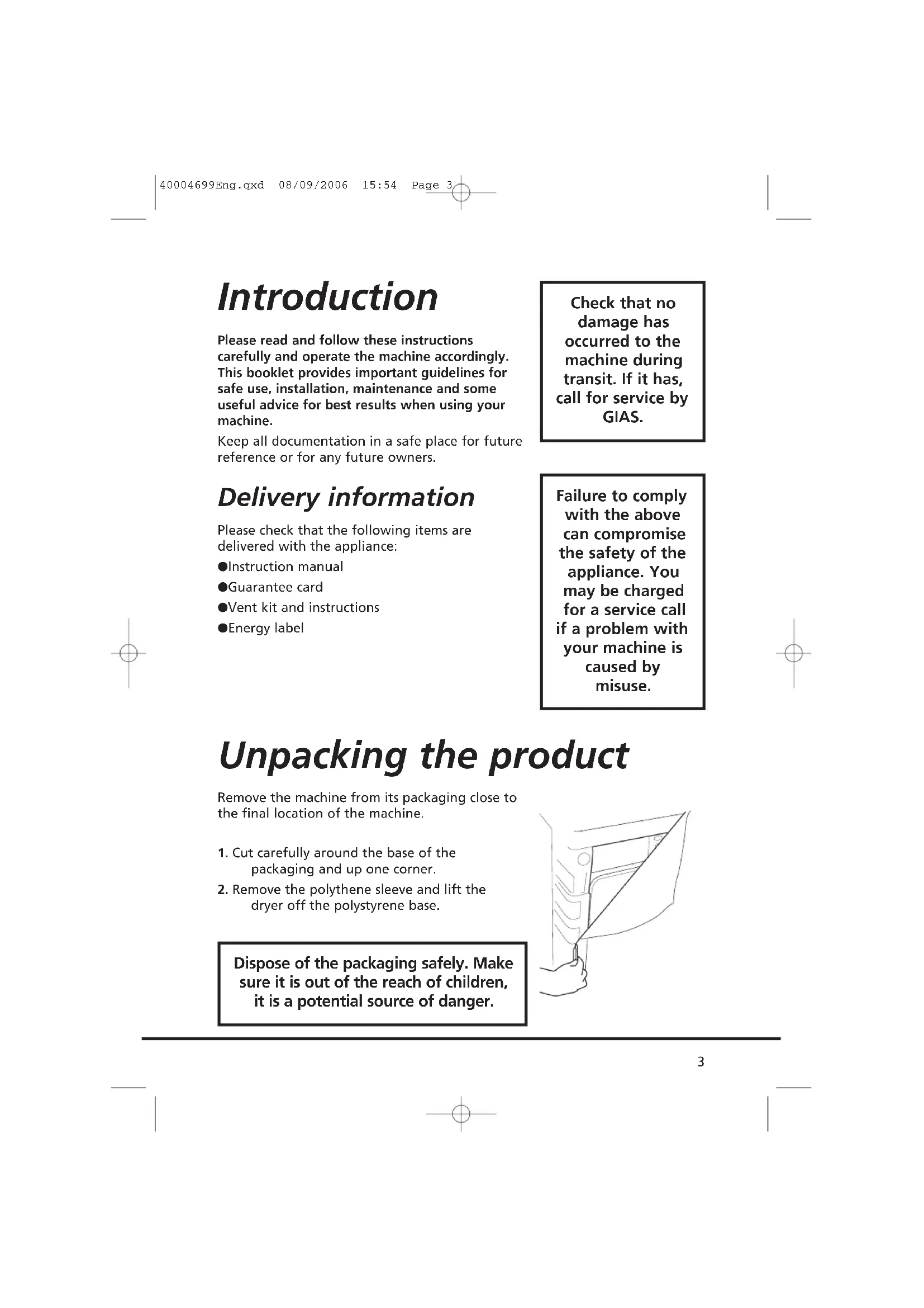 40004699Eng.qxd 08/09/2006 15:54 Page 2Introduction Please read and follow these instructions carefully and operate the machine accordingly. This booklet provides important guidelines for safe use, installation, maintenance and some useful advice for best results when using your machine. Keep all documentation in a safe place for future reference or for any future owners. Delivery information Please check that the following items are delivered with the appliance: ● Instruction manual ● Guarantee card ● Vent kit and instructions ● Energy label Remove the machine from its packaging close to the final location of the machine.