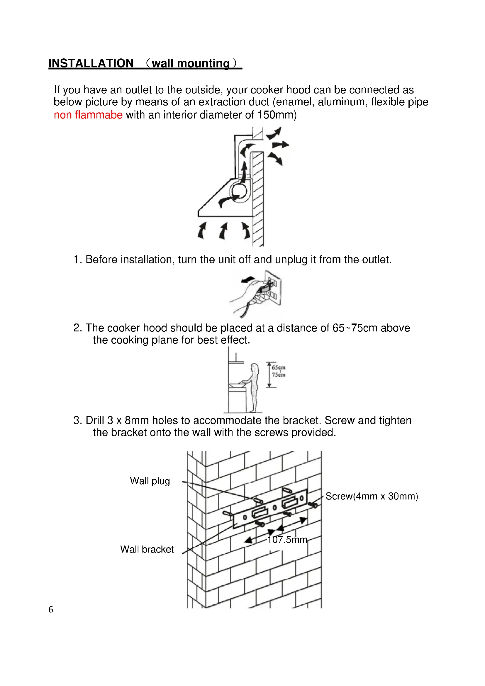 2. The cooker hood should be placed at a distance of 65~75cm above