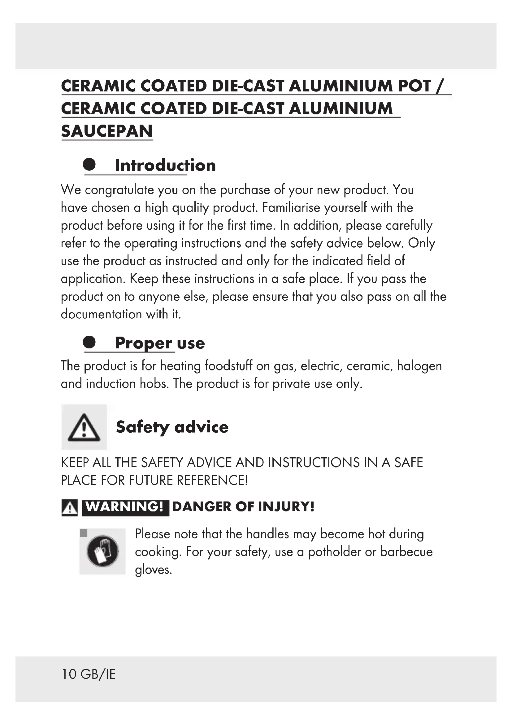 SAUCEPAN Introduction We congratulate you on the purchase of your new product. You have chosen a high quality product. Familiarise yourself with the product before using it for the first time. In addition, please carefully refer to the operating instructions and the safety advice below. Only use the product as instructed and only for the indicated field of application. Keep these instructions in a safe place. If you pass the product on to anyone else, please ensure that you also pass on all the documentation with it. Proper use The product is for heating foodstuff on gas, electric, ceramic, halogen and induction hobs. The product is for private use only. Safety advice KEEP ALL THE SAFETY ADVICE AND INSTRUCTIONS IN A SAFE PLACE FOR FUTURE REFERENCE! WARNING! DANGER OF INJURY!