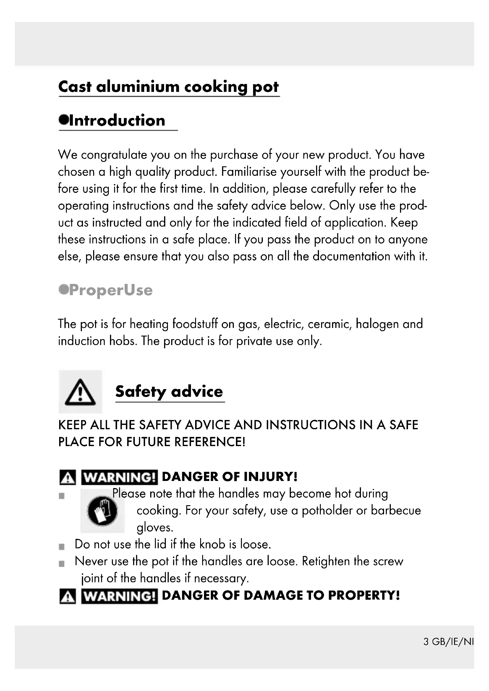 Instructions d‘utilisation et consignes de sécurité ALUMINIUMGIETWERK KOOKPAN Bedienings- en veiligheidsinstructiesGB / IE / NI Operation and Safety Notes Page 3 FR / BE Instructions d‘utilisation et consignes de sécurité Page 7 NL / BE Bedienings- en veiligheidsinstructies Pagina 12 DE / AT / CH Bedienungs- und Sicherheitshinweise Seite 163 GB/IE/NI Cast aluminium cooking pot Introduction We congratulate you on the purchase of your new product. You have chosen a high quality product. Familiarise yourself with the product be- fore using it for the first time. In addition, please carefully refer to the operating instructions and the safety advice below. Only use the prod- uct as instructed and only for the indicated field of application. Keep these instructions in a safe place. If you pass the product on to anyone else, please ensure that you also pass on all the documentation with it. Proper Use The pot is for heating foodstuff on gas, electric, ceramic, halogen and induction hobs. The product is for private use only. Safety advice KEEP ALL THE SAFETY ADVICE AND INSTRUCTIONS IN A SAFE PLACE FOR FUTURE REFERENCE! DANGER OF INJURY! Please note that the handles may become hot during cooking. For your safety, use a potholder or barbecue gloves. Do not use the lid if the knob is loose. Never use the pot if the handles are loose. Retighten the screw joint of the handles if necessary. DANGER OF DAMAGE TO PROPERTY!4 GB/IE/NI Pots and pans in which fat is being heated up must never be left unattended. Fat can very quickly overheat and ignite. Never try to extinguish a fat fire with water. Cover the flames with a pot / pan lid or a thick cloth. Use heat resistant plastic or wooden kitchen utensils in order not to damage the non-stick coating. Do not cut food directly in the pot. Do not place meat which is still dripping with liquid into hot fat. The fat splattering out on to a hot hob could easily cause a fire. To avoid heat loss, choose a hotplate with a diameter of the pot that matches. The item is suitable for keeping dishes warm inside the oven (max. 150 °C for 1 hour). High temperatures may discolour the exterior of the product. This does not indicate faulty material, nor does it impair the product’s quality or function. Never hold the hot product under cold running water. The underside of the product may be damaged or fall off. This product is suitable for dishwasher. Frequently cleaning of the pan with harsh cleaners may damage it and can cause discoloration. Aluminium pieces may discolour when placed in the dishwasher. ATTENTION! The glass lid is fragile / not impact-resistant! For washing the pot by hand, use hot water with a little ordinary washing-up liquid. Avoid using sharp or pointed objects for this in order not to damage the coating. Do not slide the product on the glass ceramic and halogen hobs to avoid scratches. Please note that using this product might cause slight discolora- tions due to the product’s light color. Such discolorations are signs of wear and do not affect the quality of the coating and its fitness for use.5 GB/IE/NI Note for induction hobs Note: A noise may occur under certain conditions, resulting from the electromagnetic properties of the heat source and the pot / pan. This is totally normal and does not imply that your induction hob or your cookware is damaged. Place the pot/ pan in the middle of the induction hotplate. CAUTION! High heating-up rate! Do not overheat cookware when preheating. The room must be aired out well, in the event cookware overheat. Usage Before first use, remove any stickers or labels from the article and rinse it in hot water. Before using the pot for the first time, boil it out with water 2 to 3 times to completely remove all manufacturing residue. Do not overheat the pot while empty or filled to prevent the non- stick effect from weakening due to damage to the coating. Disposal The packaging is made entirely of recyclable materials, which you may dispose of at local recycling facilities. Contact your local refuse disposal authority for more details of how to dispose of your worn-out product.6 GB/IE/NI Warranty The device has been manufactured to strict quality guidelines and meticulously examined before delivery. In the event of product defects you have legal rights against the retailer of this product. Your legal rights are not limited in any way by our warranty detailed below. The warranty for this device is 3 years from the date of purchase. Should this device show any fault in materials or manufacture within 3 years from the date of purchase, we will repair or replace it – at our choice – free of charge to you. The warranty period begins on the date of purchase. Please keep the original sales receipt in a safe location. This document is required as your proof of purchase. This warranty becomes void if the device has been damaged or improperly used or maintained. The warranty applies to faults in material or manufacture. This warranty does not cover product parts subject to normal wear, thus possibly considered consumables (e.g. batteries) or for damage to fragile parts, e.g. switches, rechargeable batteries or glass parts.7 FR/BE Faitout en fonte Introduction Nous vous félicitons pour l’achat de votre nouveau produit. Vous avez opté pour un produit de grande qualité. Avant la première mise en ser- vice, vous devez vous familiariser avec toutes les fonctions du produit. Veuillez lire attentivement le mode d’emploi ci-dessous et les consignes de sécurité. N’utilisez le produit que pour l’usage décrit et les domaines d’application cités. Conservez ces instructions. Si vous donnez le pro- duit à des tiers, remettez-leur également la totalité des documents.