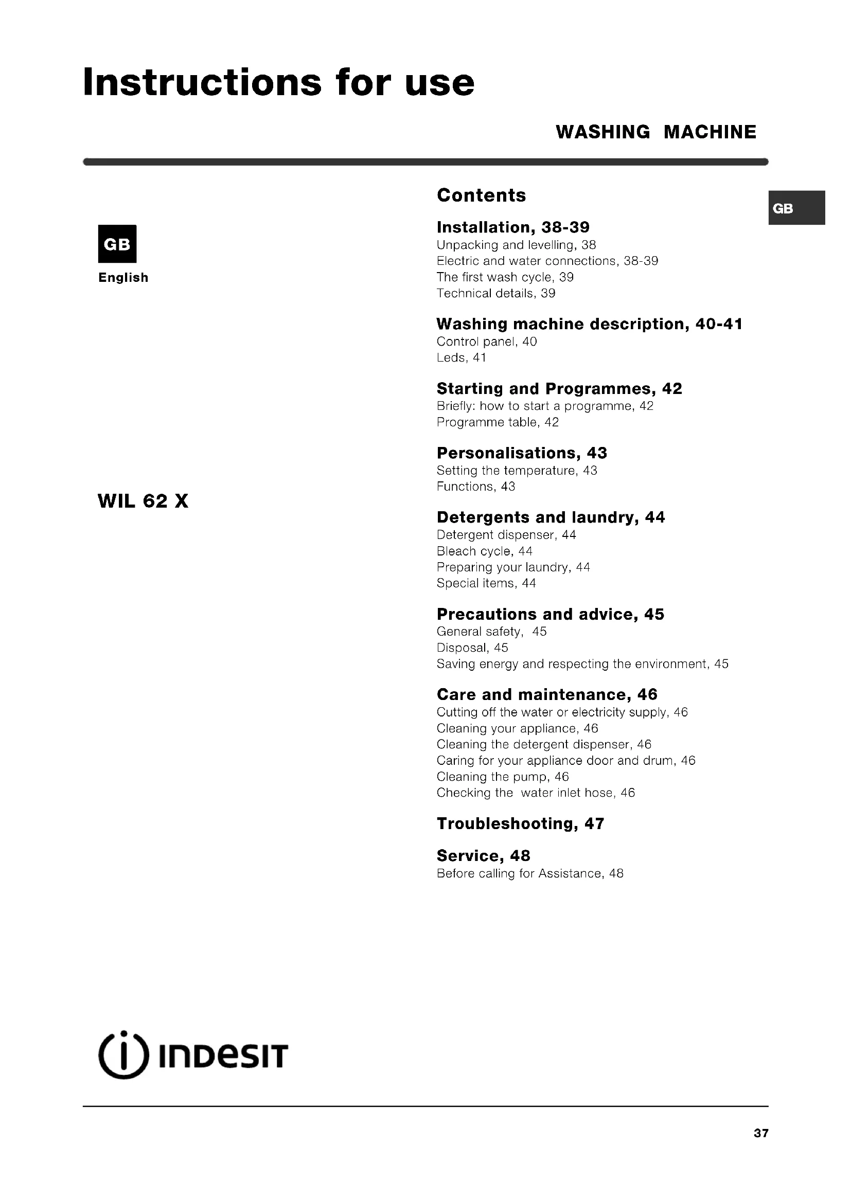 English Contents Installation, 38-39 Unpacking and levelling, 38 Electric and water connections, 38-39 The first wash cycle, 39 Technical details, 39 Washing machine description, 40-41 Control panel, 40 Leds, 41 Starting and Programmes, 42 Briefly: how to start a programme, 42 Programme table, 42 Personalisations, 43 Setting the temperature, 43 Functions, 43 Detergents and laundry, 44 Detergent dispenser, 44 Bleach cycle, 44 Preparing your laundry, 44 Special items, 44 Precautions and advice, 45 General safety, 45 Disposal, 45 Saving energy and respecting the environment, 45 Care and maintenance, 46 Cutting off the water or electricity supply, 46 Cleaning your appliance, 46 Cleaning the detergent dispenser, 46 Caring for your appliance door and drum, 46 Cleaning the pump, 46 Checking the water inlet hose, 46 Troubleshooting, 47 Service, 48 Before calling for Assistance, 48 WASHING MACHINE WIL 62 X Instructions for use GB38