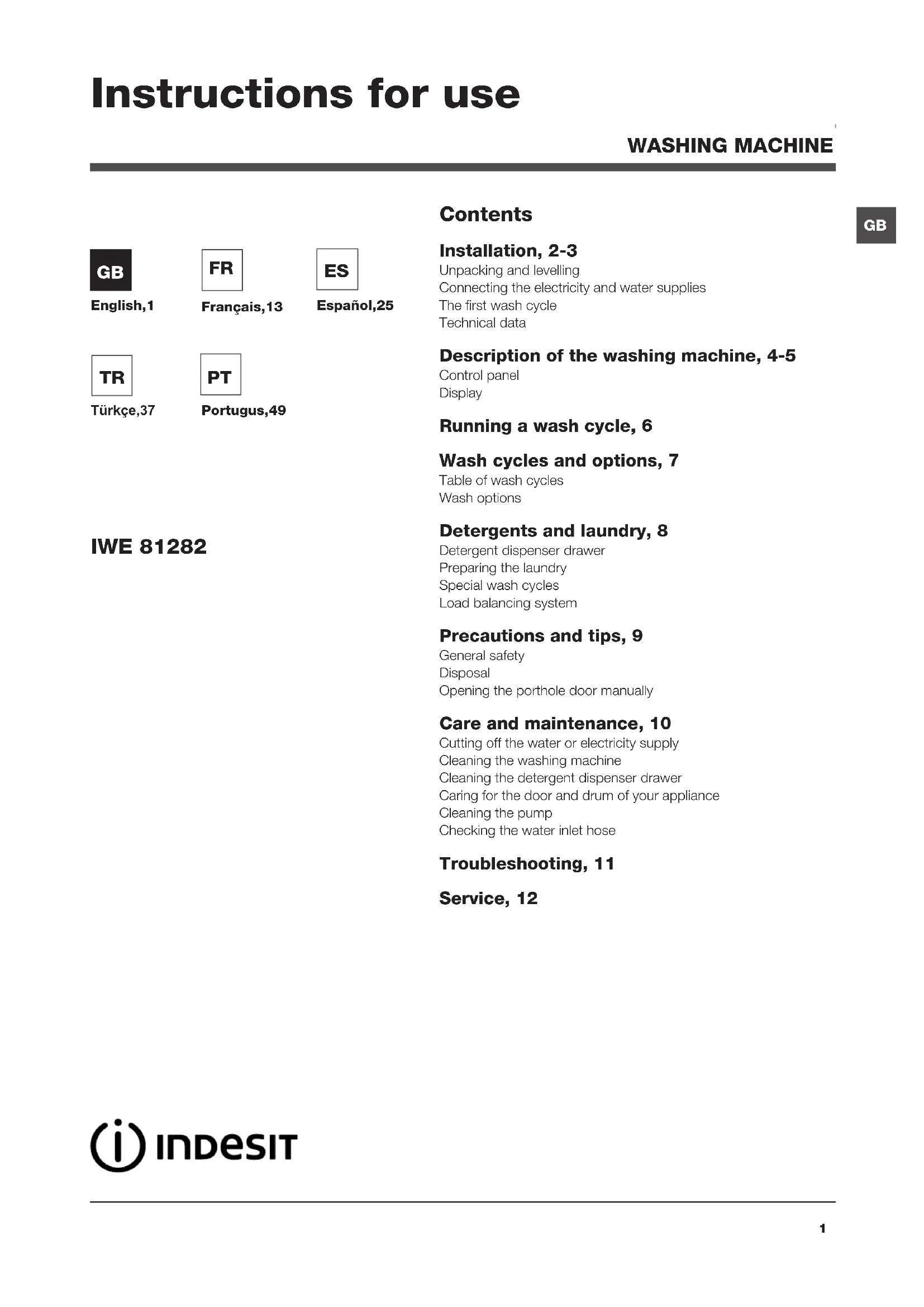 Contents Installation, 2-3 Unpacking and levelling Connecting the electricity and water supplies The first wash cycle Technical data Description of the washing machine, 4-5 Control panel Display Running a wash cycle, 6 Wash cycles and options, 7 Table of wash cycles Wash options Detergents and laundry, 8 Detergent dispenser drawer Preparing the laundry Special wash cycles Load balancing system Precautions and tips, 9 General safety Disposal Opening the porthole door manually Care and maintenance, 10 Cutting off the water or electricity supply Cleaning the washing machine Cleaning the detergent dispenser drawer Caring for the door and drum of your appliance Cleaning the pump Checking the water inlet hose Troubleshooting, 11 Service, 12 IWE 81282 Instructions for use WASHING MACHINE English,1