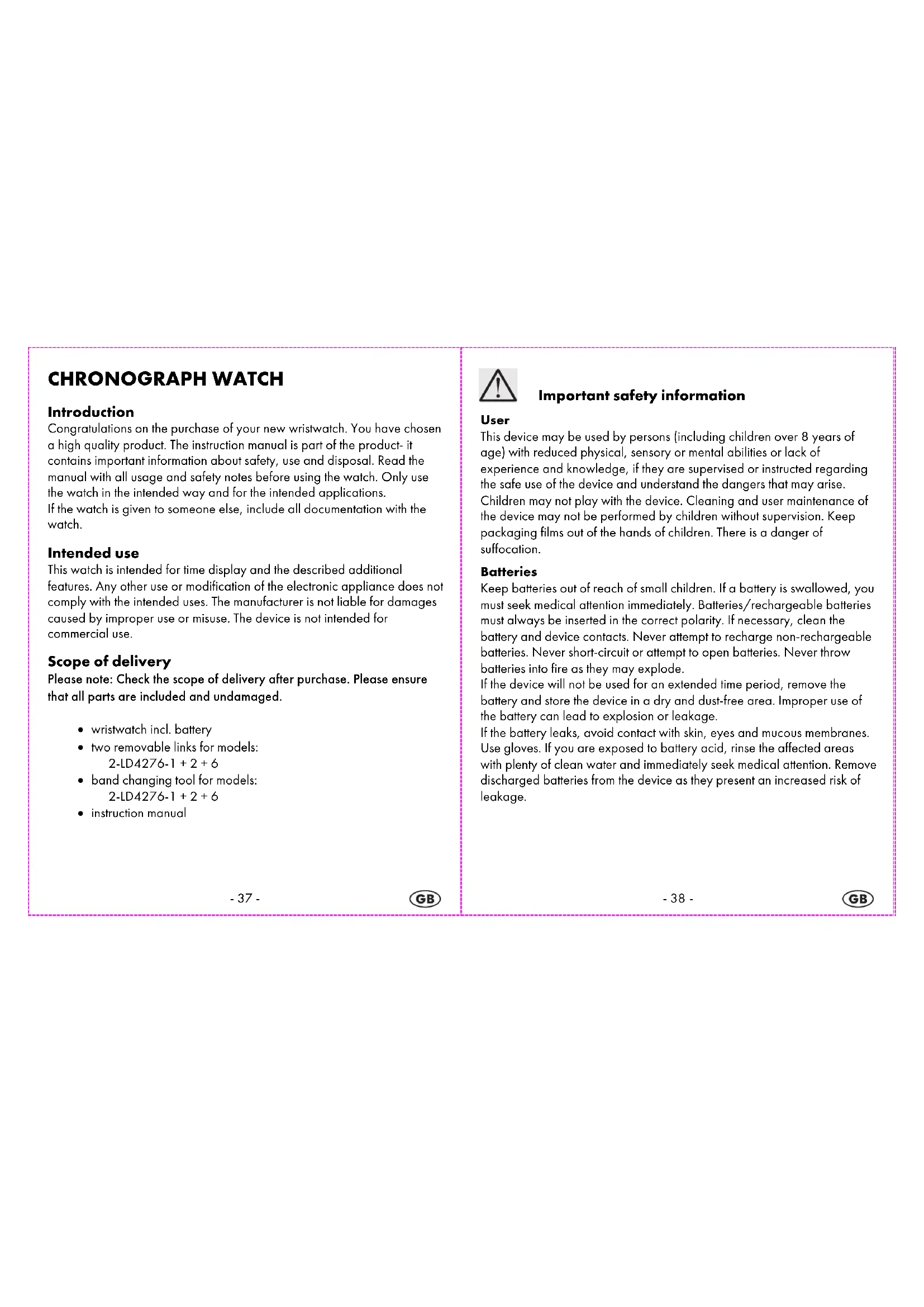 CHRONOGRAPH WATCH Introduction Congratulations on the purchase of your new wristwatch. You have chosen a high quality product. The instruction manual is part of the product- it contains important information about safety, use and disposal. Read the manual with all usage and safety notes before using the watch. Only use the watch in the intended way and for the intended applications. If the watch is given to someone else, include all documentation with the watch. Intended use This watch is intended for time display and the described additional features. Any other use or modification of the electronic appliance does not comply with the intended uses. The manufacturer is not liable for damages caused by improper use or misuse. The device is not intended for commercial use. Scope of delivery Please note: Check the scope of delivery after purchase. Please ensure that all parts are included and undamaged.