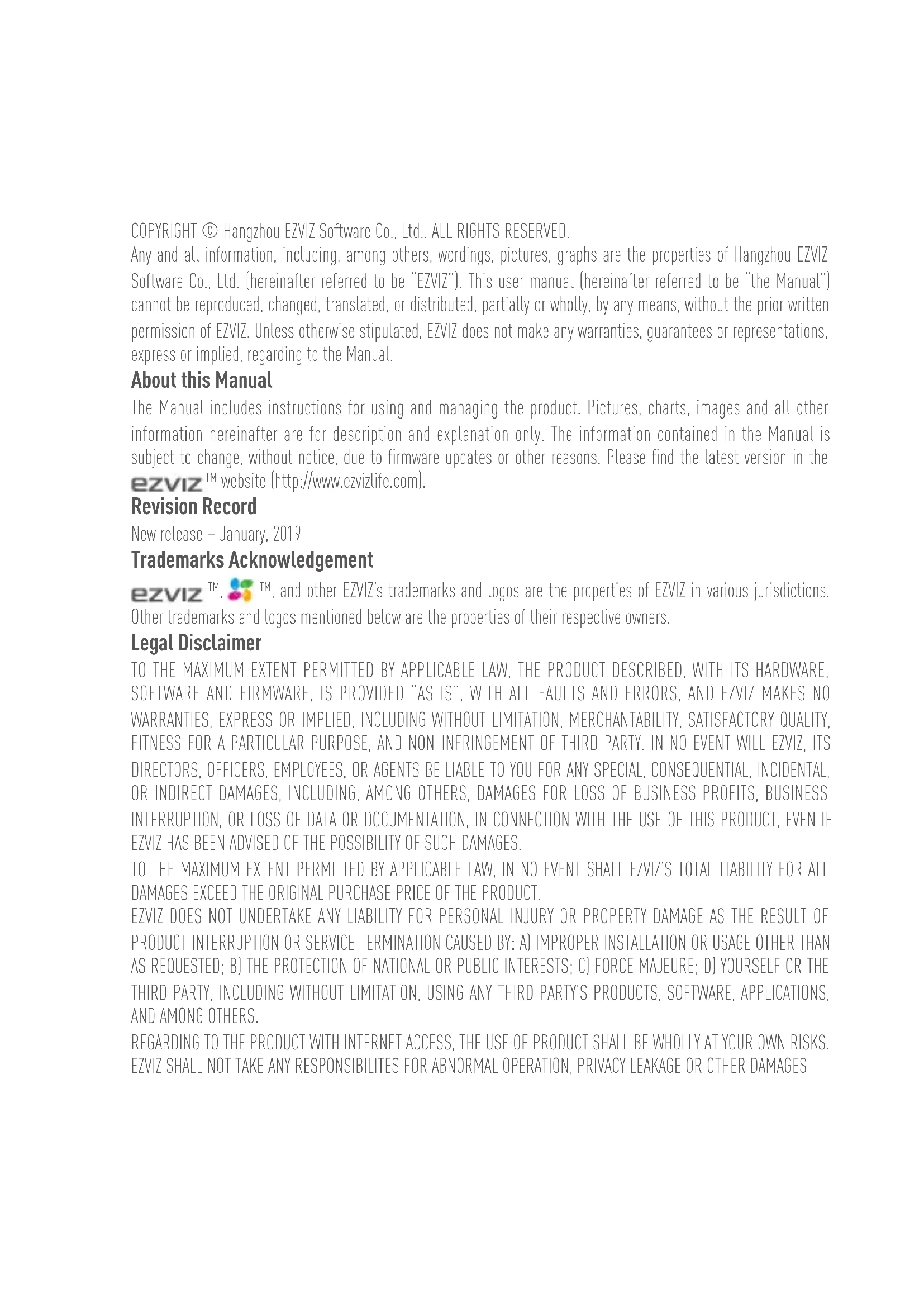 www.ezvizlife.comCOPYRIGHT © Hangzhou EZVIZ Software Co., Ltd.. ALL RIGHTS RESERVED. Any and all information, including, among others, wordings, pictures, graphs are the properties of Hangzhou EZVIZ Software Co., Ltd. (hereinafter referred to be “EZVIZ”). This user manual (hereinafter referred to be “the Manual”) cannot be reproduced, changed, translated, or distributed, partially or wholly, by any means, without the prior written permission of EZVIZ. Unless otherwise stipulated, EZVIZ does not make any warranties, guarantees or representations, express or implied, regarding to the Manual. About this Manual The Manual includes instructions for using and managing the product. Pictures, charts, images and all other information hereinafter are for description and explanation only. The information contained in the Manual is subject to change, without notice, due to firmware updates or other reasons. Please find the latest version in the ™ website (http://www.ezvizlife.com). Revision Record New release – January, 2019 Trademarks Acknowledgement ™, ™, and other EZVIZ’s trademarks and logos are the properties of EZVIZ in various jurisdictions. Other trademarks and logos mentioned below are the properties of their respective owners. Legal Disclaimer TO THE MAXIMUM EXTENT PERMITTED BY APPLICABLE LAW, THE PRODUCT DESCRIBED, WITH ITS HARDWARE, SOFTWARE AND FIRMWARE, IS PROVIDED “AS IS”, WITH ALL FAULTS AND ERRORS, AND EZVIZ MAKES NO WARRANTIES, EXPRESS OR IMPLIED, INCLUDING WITHOUT LIMITATION, MERCHANTABILITY, SATISFACTORY QUALITY, FITNESS FOR A PARTICULAR PURPOSE, AND NON-INFRINGEMENT OF THIRD PARTY. IN NO EVENT WILL EZVIZ, ITS DIRECTORS, OFFICERS, EMPLOYEES, OR AGENTS BE LIABLE TO YOU FOR ANY SPECIAL, CONSEQUENTIAL, INCIDENTAL, OR INDIRECT DAMAGES, INCLUDING, AMONG OTHERS, DAMAGES FOR LOSS OF BUSINESS PROFITS, BUSINESS INTERRUPTION, OR LOSS OF DATA OR DOCUMENTATION, IN CONNECTION WITH THE USE OF THIS PRODUCT, EVEN IF EZVIZ HAS BEEN ADVISED OF THE POSSIBILITY OF SUCH DAMAGES. TO THE MAXIMUM EXTENT PERMITTED BY APPLICABLE LAW, IN NO EVENT SHALL EZVIZ’S TOTAL LIABILITY FOR ALL DAMAGES EXCEED THE ORIGINAL PURCHASE PRICE OF THE PRODUCT. EZVIZ DOES NOT UNDERTAKE ANY LIABILITY FOR PERSONAL INJURY OR PROPERTY DAMAGE AS THE RESULT OF PRODUCT INTERRUPTION OR SERVICE TERMINATION CAUSED BY: A) IMPROPER INSTALLATION OR USAGE OTHER THAN AS REQUESTED; B) THE PROTECTION OF NATIONAL OR PUBLIC INTERESTS; C) FORCE MAJEURE; D) YOURSELF OR THE THIRD PARTY, INCLUDING WITHOUT LIMITATION, USING ANY THIRD PARTY’S PRODUCTS, SOFTWARE, APPLICATIONS, AND AMONG OTHERS. REGARDING TO THE PRODUCT WITH INTERNET ACCESS, THE USE OF PRODUCT SHALL BE WHOLLY AT YOUR OWN RISKS. EZVIZ SHALL NOT TAKE ANY RESPONSIBILITES FOR ABNORMAL OPERATION, PRIVACY LEAKAGE OR OTHER DAMAGESRESULTING FROM CYBER ATTACK, HACKER ATTACK, VIRUS INSPECTION, OR OTHER INTERNET SECURITY RISKS; HOWEVER, EZVIZ WILL PROVIDE TIMELY TECHNICAL SUPPORT IF REQUIRED. SURVEILLANCE LAWS AND DATA PROTECTION LAWS VARY BY JURISDICTION. PLEASE CHECK ALL RELEVANT LAWS IN YOUR JURISDICTION BEFORE USING THIS PRODUCT IN ORDER TO ENSURE THAT YOUR USE CONFORMS TO THE APPLICABLE LAW. EZVIZ SHALL NOT BE LIABLE IN THE EVENT THAT THIS PRODUCT IS USED WITH ILLEGITIMATE PURPOSES. IN THE EVENT OF ANY CONFLICTS BETWEEN THE ABOVE AND THE APPLICABLE LAW, THE LATTER PREVAILS. Regulatory Information FCC Information This device complies with Part 15 of the FCC Rules. Operation is subject to the following two conditions: (1) This device may not cause harmful interference, and (2) This device must accept any interference received, including interference that may cause undesired operation. Note: This product has been tested and found to comply with the limits for a Class B digital device, pursuant to Part 15 of the FCC Rules. These limits are designed to provide reasonable protection against harmful interference in a residential installation. This product generates, uses, and can radiate radio frequency energy and, if not installed and used in accordance with the instructions, may cause harmful interference to radio communications. However, there is no guarantee that interference will not occur in a particular installation. If this product does cause harmful interference to radio or television reception, which can be determined by turning the equipment off and on, the user is encouraged to try to correct the interference by one or more of the following measures: —Reorient or relocate the receiving antenna. —Increase the separation between the equipment and receiver. —Connect the equipment into an outlet on a circuit different from that to which the receiver is connected. —Consult the dealer or an experienced radio/TV technician for help. Please take attention that changes or modification not expressly approved by the party responsible for compliance could void the user’s authority to operate the equipment. This equipment should be installed and operated with a minimum distance 20cm between the radiator and your body. This device complies with Industry Canada licence-exempt RSS standard(s). Operation is subject to the following two conditions: (1) this device may not cause interference, and (2) this device must accept any interference, including interference that may cause undesired operation of the device. Under Industry Canada regulations, this radio transmitter may only operate using an antenna of a type and maximum (or lesser) gain approved for the transmitter by Industry Canada. To reduce potential radio interference to other users, the antenna type and its gain should be so chosen that the equivalent isotropically radiated power (e.i.r.p.) is not more than that necessary for successful communication.SAVE THIS MANUAL FOR FUTURE REFERENCE EU Conformity Statement This product and - if applicable - the supplied accessories too are marked with "CE" and comply therefore with the applicable harmonized European standards listed under the Radio Equipment Directive 2