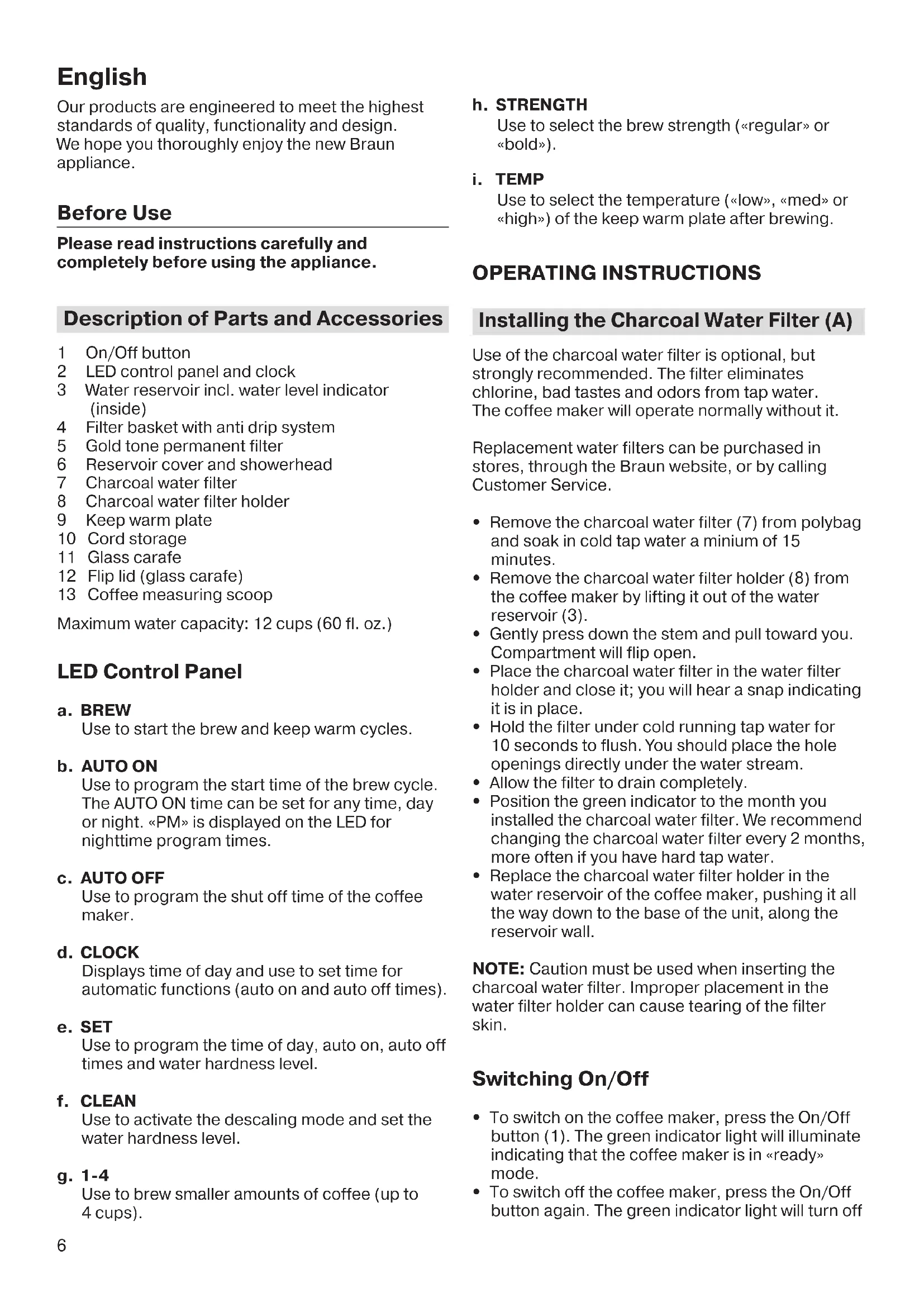 Use to select the temperature («low», «med» or «high») of the keep warm plate after brewing. OPERATING INSTRUCTIONS Installing the Charcoal Water Filter (A) Use of the charcoal water filter is optional, but strongly recommended. The filter eliminates chlorine, bad tastes and odors from tap water. The coffee maker will operate normally without it. Replacement water filters can be purchased in stores, through the Braun website, or by calling Customer Service.