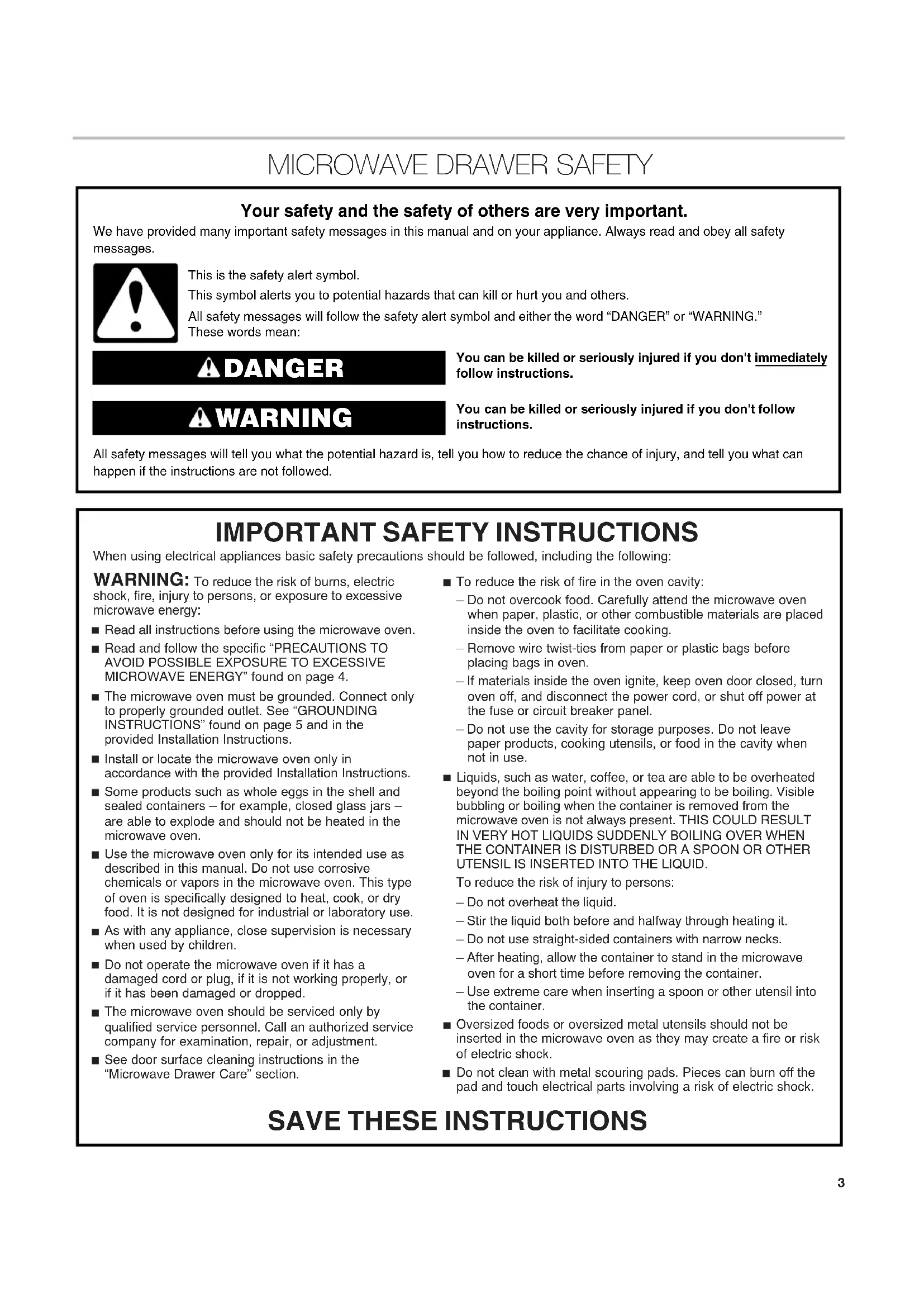 To reduce the risk of burns, electric shock, fire, injury to persons, or exposure to excessive microwave energy:To reduce the risk of fire in the oven cavity:– Do not overcook food. Carefully attend the microwave ovenwhen paper, plastic, or other combustible materials are placedinside the oven to facilitate cooking.– Remove wire twist-ties from paper or plastic bags beforeplacing bags in oven.– If materials inside the oven ignite, keep oven door closed, turnoven off, and disconnect the power cord, or shut off power atthe fuse or circuit breaker panel.– Do not use the cavity for storage purposes. Do not leavepaper products, cooking utensils, or food in the cavity whennot in use.Liquids, such as water, coffee, or tea are able to be overheated beyond the boiling point without appearing to be boiling. Visible bubbling or boiling when the container is removed from the microwave oven is not always present. THIS COULD RESULT IN VERY HOT LIQUIDS SUDDENLY BOILING OVER WHEN THE CONTAINER IS DISTURBED OR A SPOON OR OTHER UTENSIL IS INSERTED INTO THE LIQUID.To reduce the risk of injury to persons:– Do not overheat the liquid.– Stir the liquid both before and halfway through heating it.– Do not use straight-sided containers with narrow necks.– After heating, allow the container to stand in the microwaveoven for a short time before removing the container.– Use extreme care when inserting a spoon or other utensil intothe container.Oversized foods or oversized metal utensils should not be inserted in the microwave oven as they may create a fire or risk of electric shock.Do not clean with metal scouring pads. Pieces can burn off the pad and touch electrical parts involving a risk of electric shock.Read all instructions before using the microwave oven.Read and follow the specific “PRECAUTIONS TO AVOID POSSIBLE EXPOSURE TO EXCESSIVE MICROWAVE ENERGY” found on page 4.The microwave oven must be grounded. Connect only to properly grounded outlet. See “GROUNDING INSTRUCTIONS” found on page 5 and in the provided Installation Instructions.Install or locate the microwave oven only in accordance with the provided Installation Instructions. Some products such as whole eggs in the shell and sealed containers – for example, closed glass jars – are able to explode and should not be heated in the microwave oven.Use the microwave oven only for its intended use as described in this manual. Do not use corrosive chemicals or vapors in the microwave oven. This type of oven is specifically designed to heat, cook, or dry food. It is not designed for industrial or laboratory use.As with any appliance, close supervision is necessary when used by children.Do not operate the microwave oven if it has a damaged cord or plug, if it is not working properly, or if it has been damaged or dropped. The microwave oven should be serviced only by qualified service personnel. Call an authorized service company for examination, repair, or adjustment.See door surface cleaning instructions in the “Microwave Drawer Care” section. You can be killed or seriously injured if you don't immediately You can be killed or seriously injured if you don'tfollow All safety messages will tell you what the potential hazard is, tell you how to reduce the chance of injury, and tell you what can happen if the instructions are not followed. Your safety and the safety of others are very important. We have provided many important safety messages in this manual and on your appliance. Always read and obey all safety messages.This is the safety alert symbol.This symbol alerts you to potential hazards that can kill or hurt you and others.All safety messages will follow the safety alert symbol and either the word “DANGER” or “WARNING.”These words mean:follow instructions.instructions. DANGER WARNING4