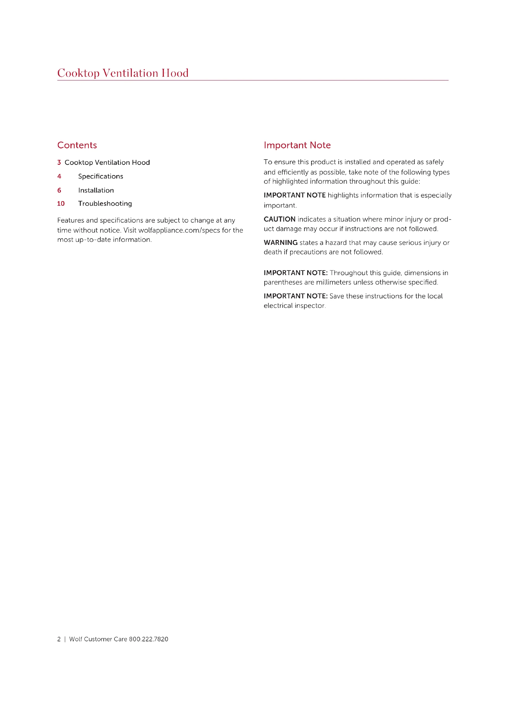 Cooktop Ventilation Hood Installation Guide SPECIFICATIONS, INSTALLATION, AND MORE2 | Wolf Customer Care 800.222.7820 Cooktop Ventilation Hood Contents 3 Cooktop Ventilation Hood 4 Specifications 6 Installation 10 Troubleshooting Features and specifications are subject to change at any time without notice. Visit wolfappliance.com/specs for the most up-to-date information. Important Note To ensure this product is installed and operated as safely and eciently as possible, take note of the following types of highlighted information throughout this guide: IMPORTANT NOTE highlights information that is especially important. CAUTION indicates a situation where minor injury or prod- uct damage may occur if instructions are not followed. WARNING states a hazard that may cause serious injury or death if precautions are not followed. IMPORTANT NOTE: Throughout this guide, dimensions in parentheses are millimeters unless otherwise specified. IMPORTANT NOTE: Save these instructions for the local electrical inspector.wolfappliance.com | 3 Rating plate location RATING PLATE IMPORTANT INSTRUCTIONS WARNING TO REDUCE THE RISK OF FIRE, ELECTRIC
