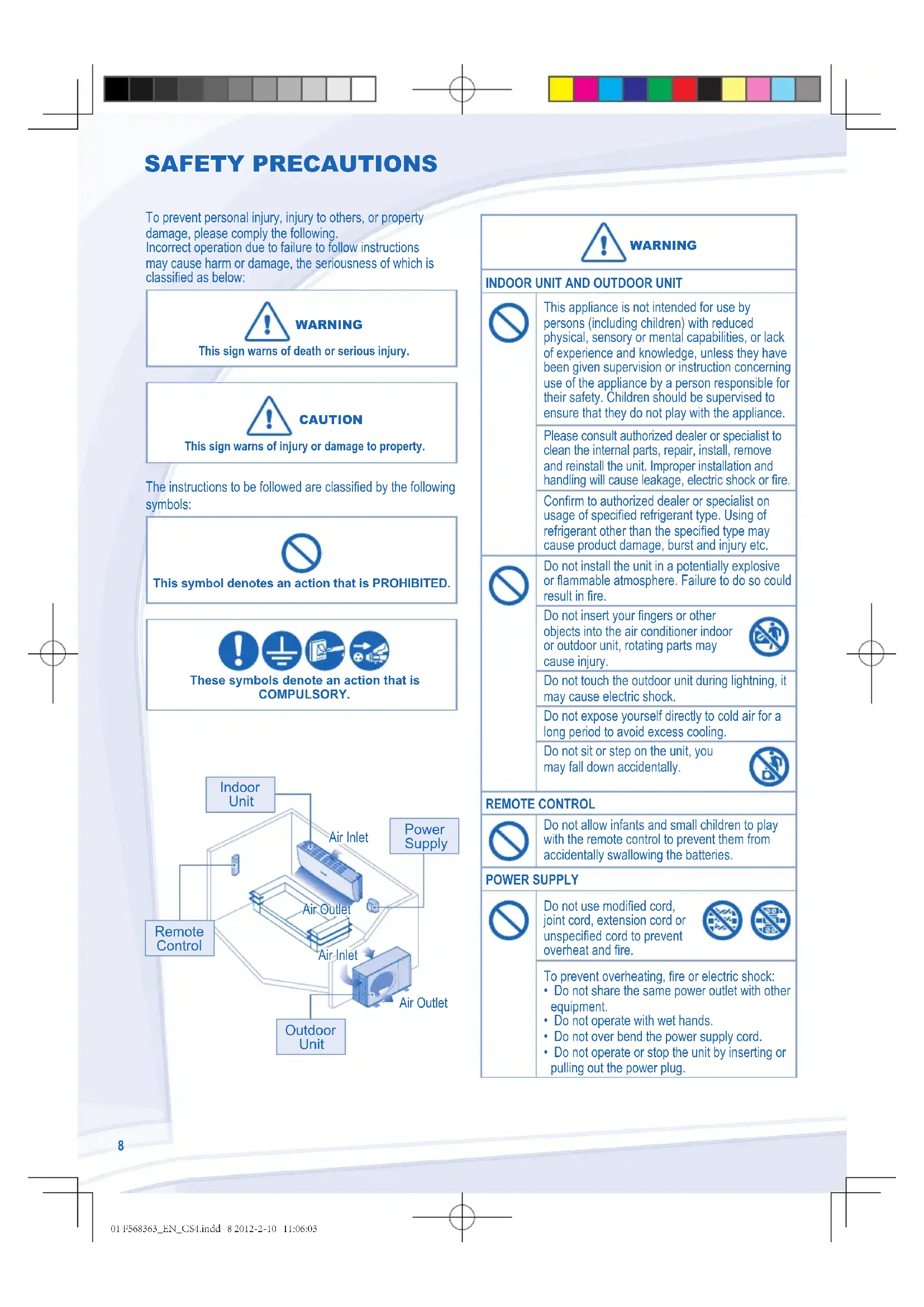 - Do not operate or stop the unit by inserting or pulling out the power plug. Air Inlet Air Outlet Air Inlet Remote Control Power Supply Outdoor Unit Indoor Unit Air Outlet 01 F568363_EN_CS4.indd 8 2012-2-10 11:06:03ENGLISH