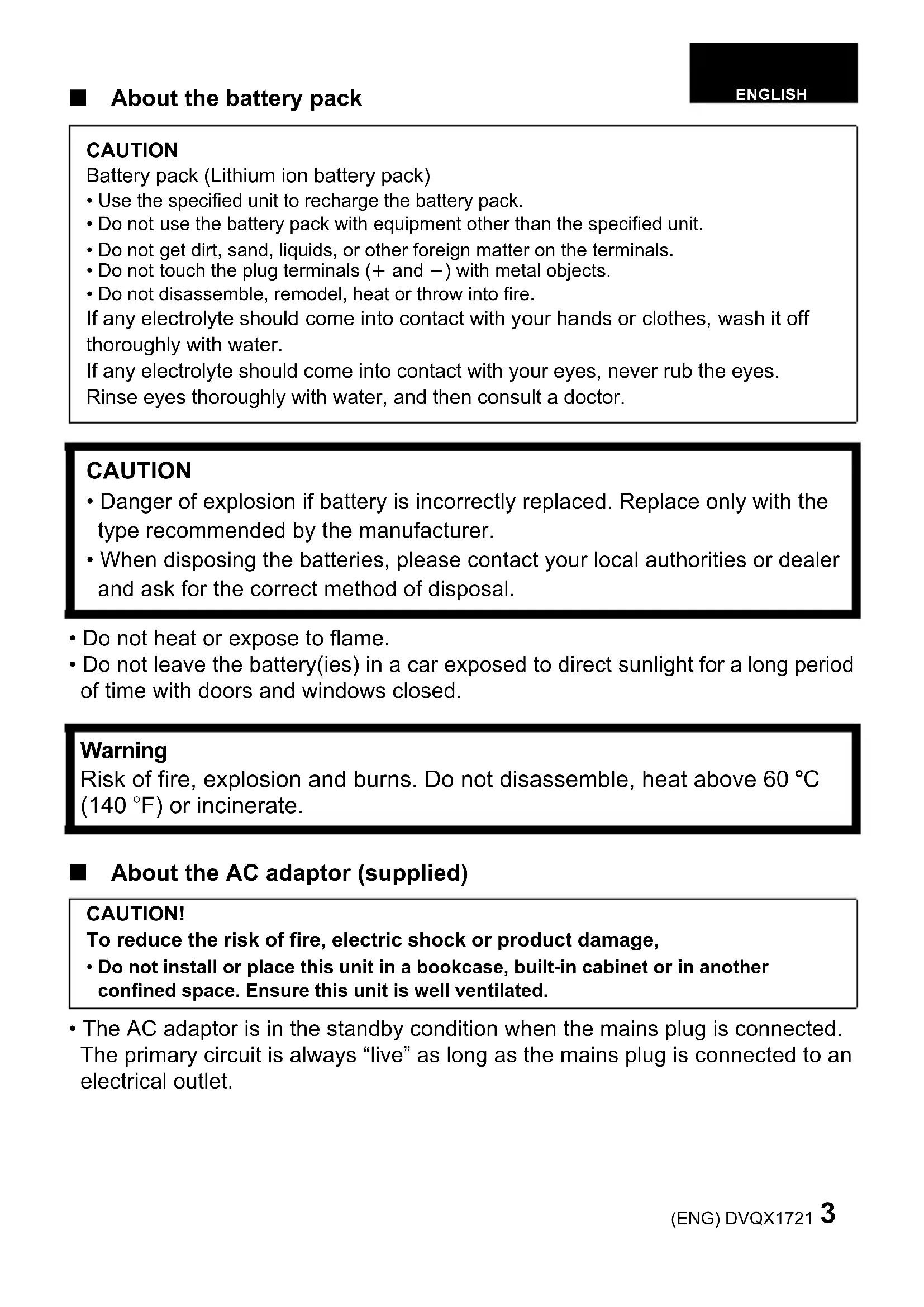 - The AC adaptor is in the standby condition when the mains plug is connected. The primary circuit is always “live” as long as the mains plug is connected to an electrical outlet. CAUTION Battery pack (Lithium ion battery pack)