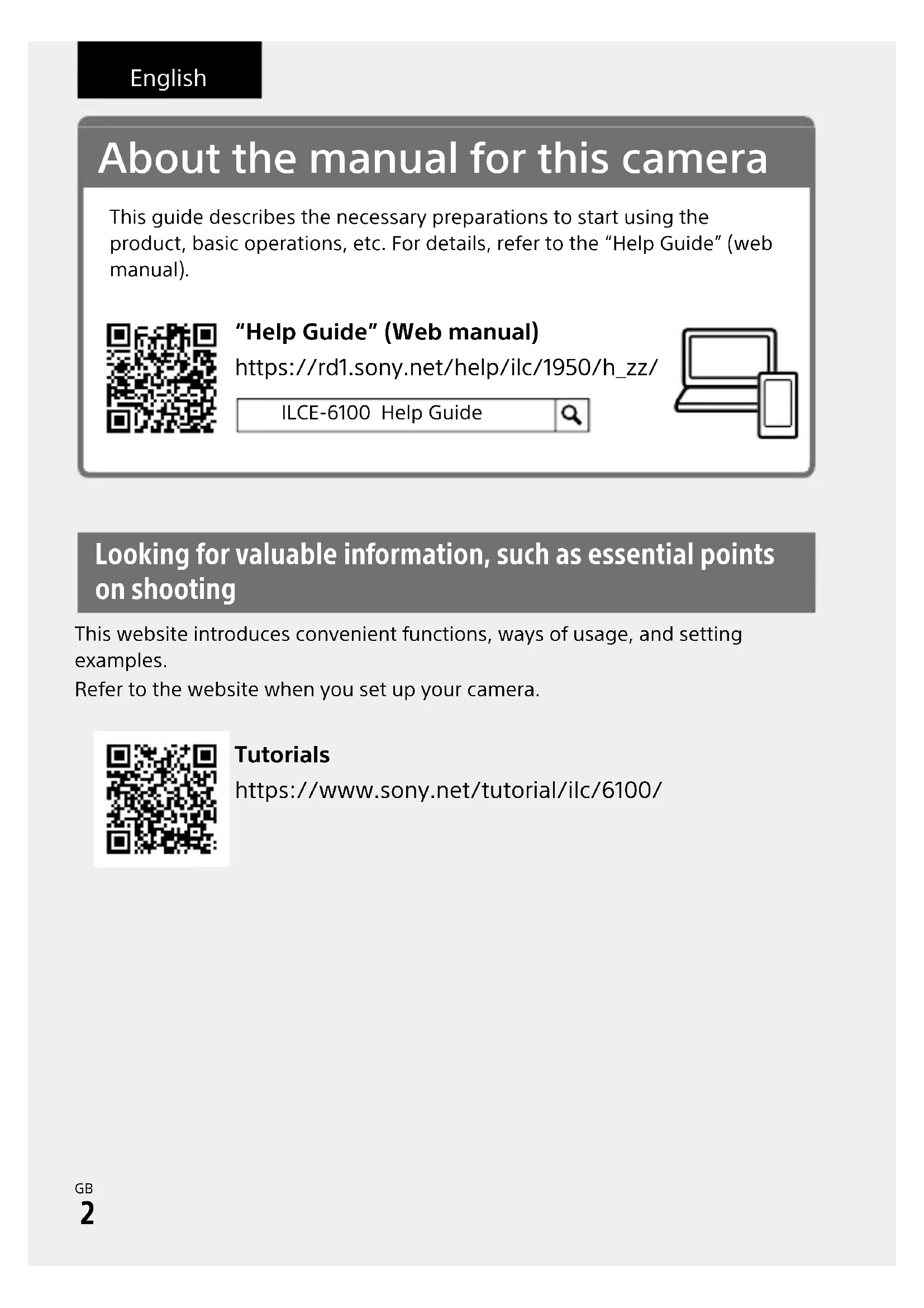 \\Win-473\camera\CX88400(PD)\Multi\06_Compose\5009876411_14lang\5009876411ILCE6100CEC\01GB-ILCE6100CEC\01GB.indd DTP data saved: 2019/07/30 13:54 PDF file created: 2019/07/31 09:15 Looking for valuable information, such as essential points on shooting This website introduces convenient functions, ways of usage, and setting examples.Refer to the website when you set up your camera. About the manual for this camera This guide describes the necessary preparations to start using the product, basic operations, etc. For details, refer to the “Help Guide” (web manual). https://rd1.sony.net/help/ilc/1950/h_zz/ “Help Guide” (Web manual) ILCE-6100 Help Guide Tutorials https://www.sony.net/tutorial/ilc/6100/ EnglishILCE-61005-009-876-41(1)