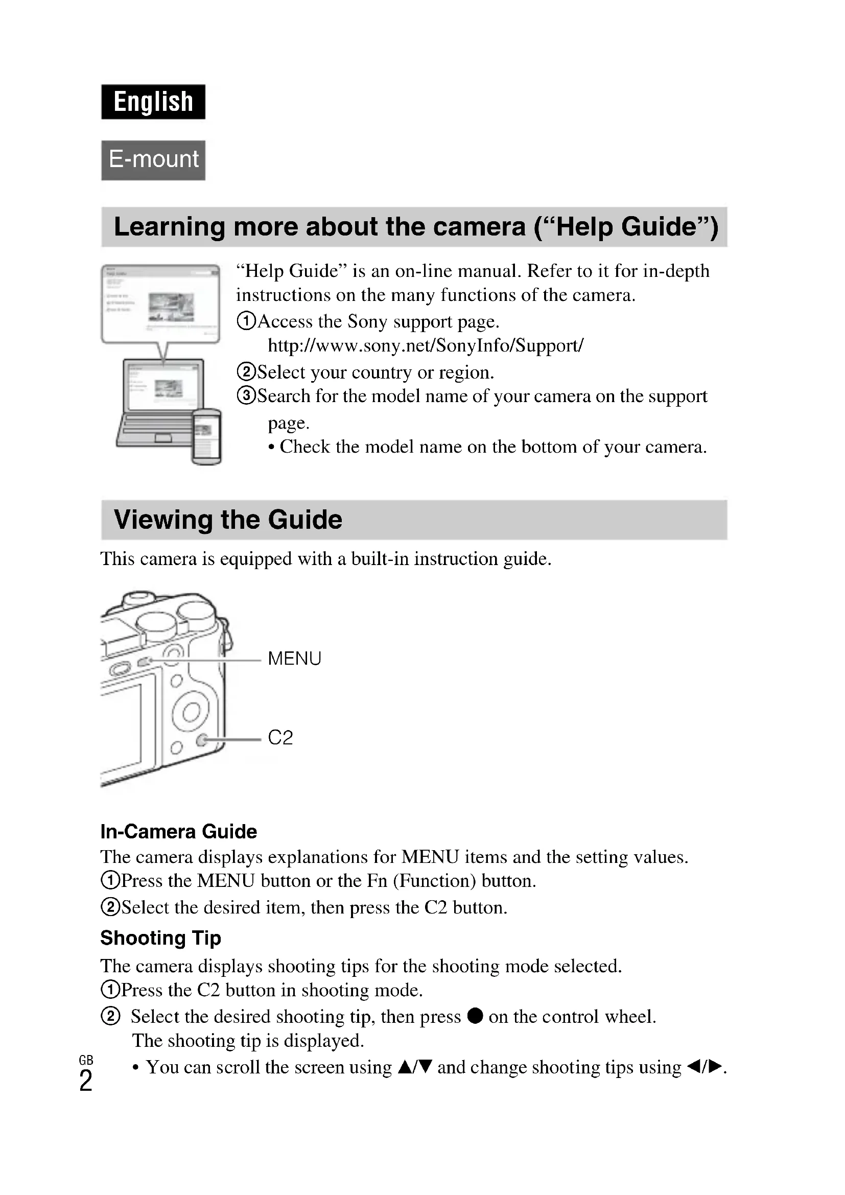 - You can scroll the screen using v/V and change shooting tips using b/B. English E-mount Learning more about the camera (“Help Guide”) “Help Guide” is an on-line manual. Refer to it for in-depth instructions on the many functions of the camera. 1 Access the Sony support page. http://www.sony.net/SonyInfo/Support/ 2 Select your country or region. 3 Search for the model name of your camera on the support page.