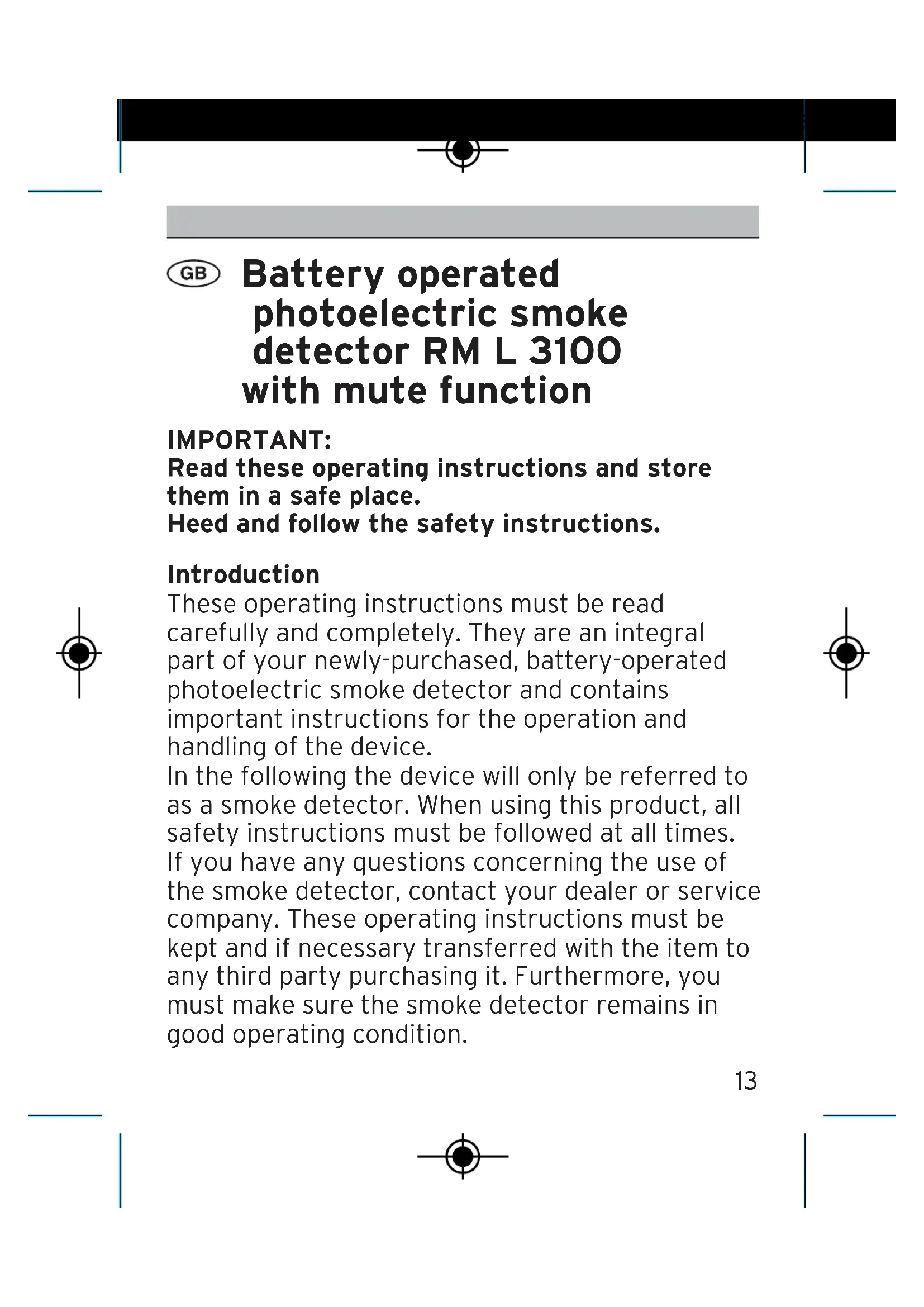 Operating Instructions RM L 3100 086215 Rauchwarnmelder RM L 3100.qxp_086215 BA_RauchwarThe smoke detector then returns to normal sensitivity. Important: If a malfunction is detected the device will beep every 40 seconds. Function test The smoke detector is equipped with a test button. Press the test button. The alarm sounds three times, followed by a 1.5 second pause. This interval is repeated until the button is released. If there is no additional or other signal a defect has been detected. Remark: If the smoke detector does not function properly please contact our service department. Maintenance and care To ensure the functional reliability of the smoke detector it must be serviced at least once a year, as specified in DIN EN 14676. The following procedure must be used: – Dust the smoke detector with a soft cloth. – If necessary, remove dirt with a damp cloth. Do not use cleaning agents. – Carry out a function test (see function test).