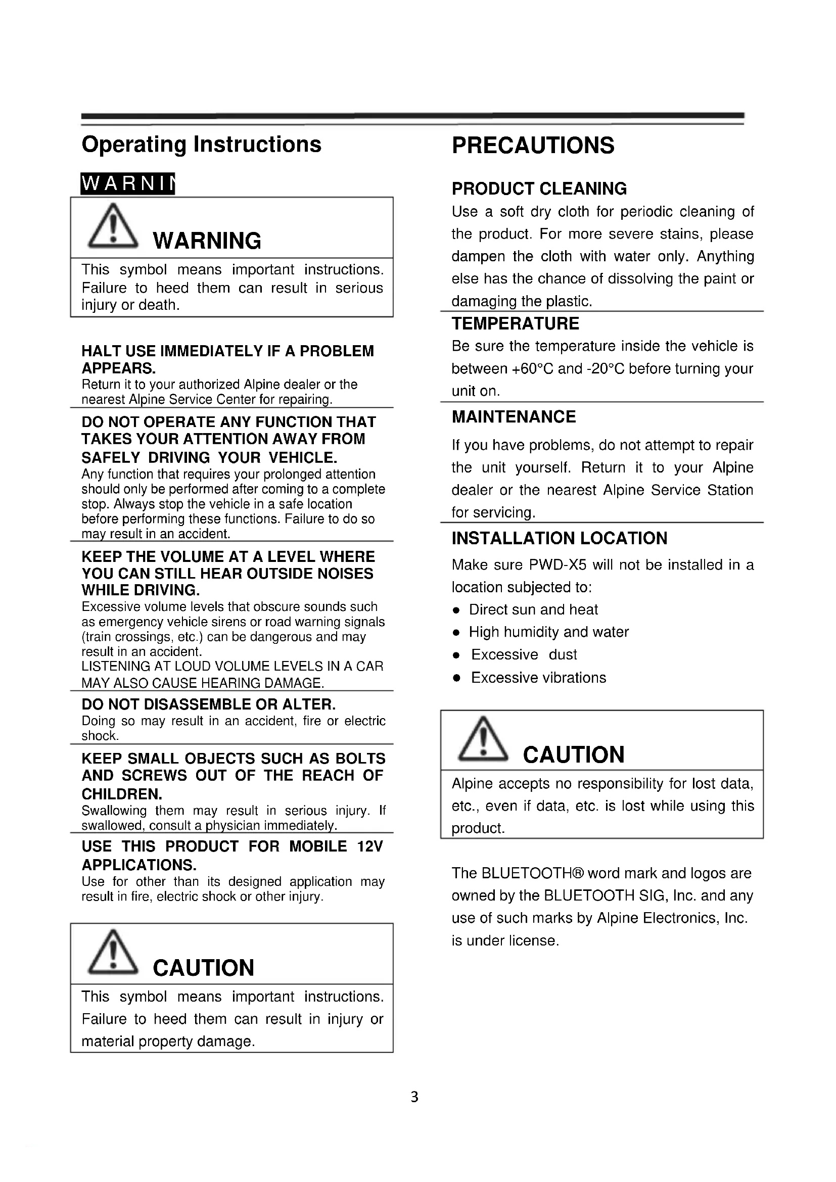 APPLICATIONS. Use for other than its designed application may result in fire, electric shock or other injury. CAUTION This symbol means important instructions. Failure to heed them can result in injury or material property damage. PRECAUTIONS PRODUCT CLEANING Use a soft dry cloth for periodic cleaning of the product. For more severe stains, please dampen the cloth with water only. Anything else has the chance of dissolving the paint or damaging the plastic. TEMPERATURE Be sure the temperature inside the vehicle is between +60°C and -20°C before turning your unit on. MAINTENANCE If you have problems, do not attempt to repair the unit yourself. Return it to your Alpine dealer or the nearest Alpine Service Station for servicing. INSTALLATION LOCATION Make sure PWD-X5 will not be installed in a location subjected to: ● Direct sun and heat ● High humidity and water ● Excessive dust ● Excessive vibrations CAUTION Alpine accepts no responsibility for lost data, etc., even if data, etc. is lost while using this product.