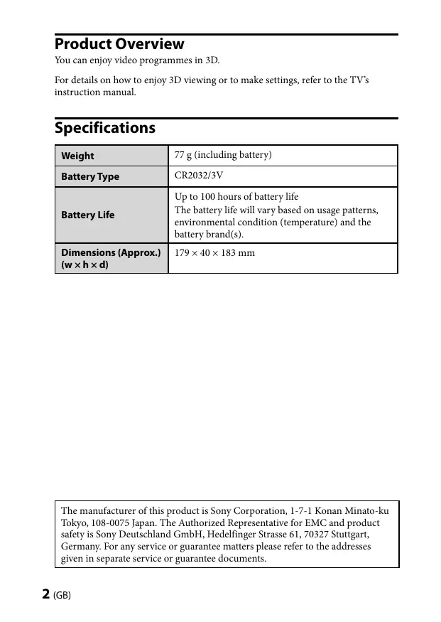 TDG-BR100 © 2010 Sony Corporation Product Overview You can enjoy video programmes in 3D. For details on how to enjoy 3D viewing or to make settings, refer to the TV’s instruction manual. Specifications Weight 77 g (including battery) Battery Type CR2032/3V Battery Life Up to 100 hours of battery life The battery life will vary based on usage patterns, environmental condition (temperature) and the battery brand(s). Dimensions (Approx.) (w × h × d) 179 × 40 × 183 mm The manufacturer of this product is Sony Corporation, 1-7-1 Konan Minato-ku Tokyo, 108-0075 Japan. The Authorized Representative for EMC and product safety is Sony Deutschland GmbH, Hedelfinger Strasse 61, 70327 Stuttgart, Germany. For any service or guarantee matters please refer to the addresses given in separate service or guarantee documents. (GB) Disposal of waste batteries (applicable in the European Union and other European countries with separate collection systems) This symbol on the battery or on the packaging indicates that the battery provided with this product shall not be treated as household waste. On certain batteries this symbol might be used in combination with a chemical symbol. The chemical symbols for mercury (Hg) or lead (Pb) are added if the battery contains more than 0.0005% mercury or 0.004% lead. By ensuring these batteries are disposed of correctly, you will help prevent potentially negative consequences for the environment and human health which could otherwise be caused by inappropriate waste handling of the battery. The recycling of the materials will help to conserve natural resources. In case of products that for safety, performance or data integrity reasons require a permanent connection with an incorporated battery, this battery should be replaced by qualified service staff only. To ensure that the battery will be treated properly, hand over the product at end-of-life to the applicable collection point for the recycling of electrical and electronic equipment. For all other batteries, please view the section on how to remove the battery from the product safely. Hand the battery over to the applicable collection point for the recycling of waste batteries. For more detailed information about recycling of this product or battery, please contact your local Civic Office, your household waste disposal service or the shop where you purchased the product. Disposal of the 3D Glasses Disposal of Old Electrical & Electronic Equipment (Applicable in the European Union and other European countries with separate collection systems) This symbol on the product or on its packaging indicates that this product shall not be treated as household waste. Instead it shall be handed over to the applicable collection point for the recycling of electrical and electronic equipment. By ensuring this product is disposed of correctly, you will help prevent potential negative consequences for the environment and human health, which could otherwise be caused by inappropriate waste handling of this product. The recycling of materials will help to conserve natural resources. For more detailed information about recycling of this product, please contact your local Civic Office, your household waste disposal service or the shop where you purchased the product. (GB)
