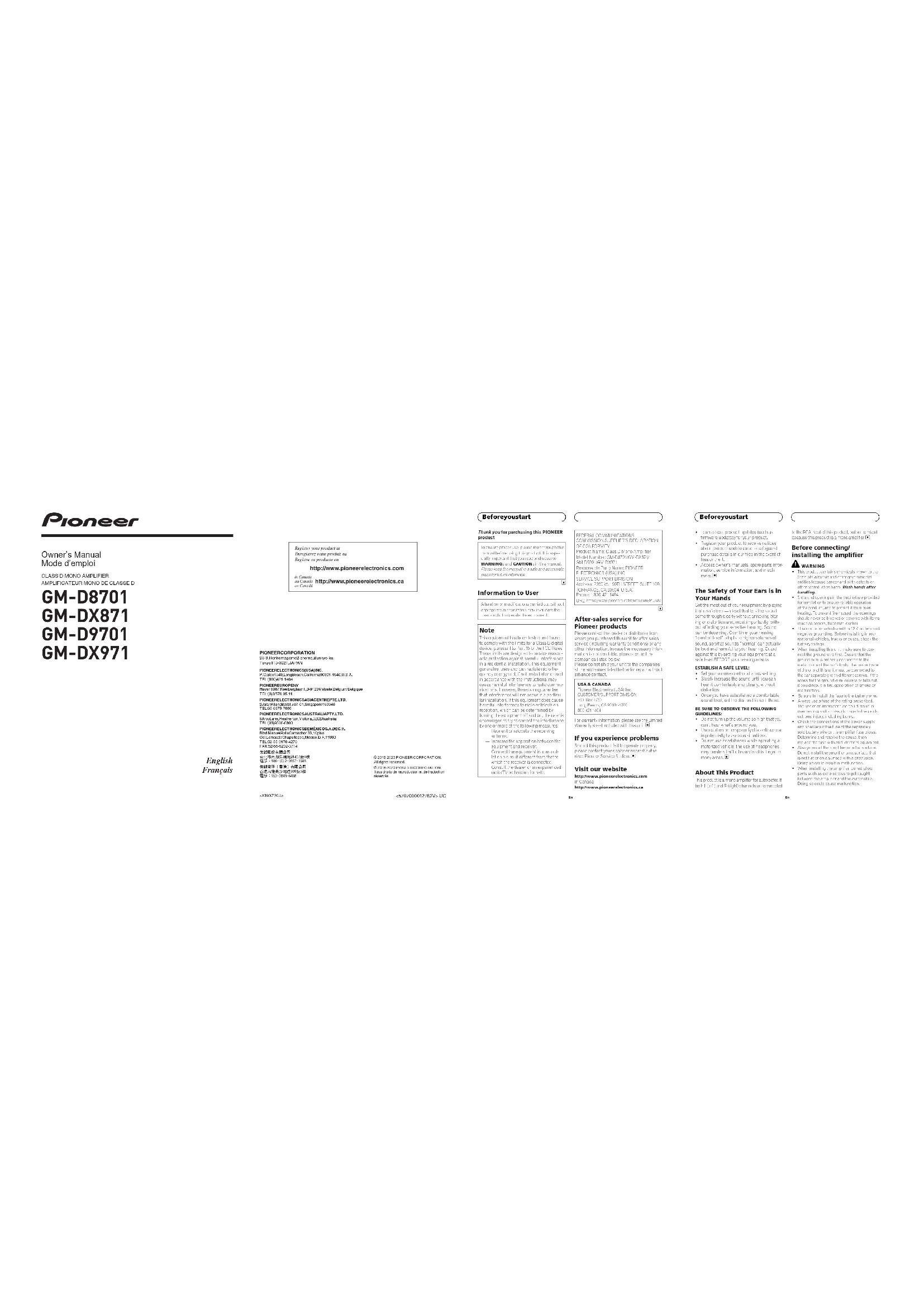 Slots and openings in the cabinet are provided for ventilation to ensure reliable operation of the product, and to protect it from over- heating. To prevent fire hazard, the openings should never be blocked or covered with items (such as papers, floor mat, cloths). This unit is for vehicles with a 12 V battery and negative grounding. Before installing in rec- reational vehicles, trucks or buses, check the battery voltage. When installing this unit, make sure to con- nect the ground wire first. Ensure that the ground wire is properly connected to the metal parts of the car’s body. The ground wire of the one of this unit must be connected to the car separately with different screws. If the screw for the ground wire loosens or falls out, it could result in fire, generation of smoke or malfunction. Be sure to install the fuse to the battery wire. Always use a fuse of the rating prescribed. The use of an improper fuse could result in overheating and smoke, damage to the prod- uct, and injury, including burns. Check the connections of the power supply and speakers if the fuse of the separately sold battery wire or the amplifier fuse blows. Determine and resolve the cause, then replace the fuse with and identical equivalent. Always install the amplifier on a flat surface. Do not install the amplifier on a surface that is not flat or on a surface with a protrusion. Doing so could result in malfunction. When installing the amplifier, do not allow parts such as extra screws to get caught between the amplifier and the automobile. Doing so could cause malfunction. <KNGZ20J> <5707000012762V> UC © 2018-2020 PIONEER CORPORATION.All rights reserved.© 2018-2020 PIONEER CORPORATION.Tous droits de reproduction et de traduction réservés.CAUTION ! Always keep the volume low enough to hear outside sounds. ! Extended use of the car stereo while the en- gine is at rest or idling may exhaust the bat- tery. ! This product is evaluated in moderate and tro- pical climate condition under the Audio, video and similar electronic apparatus - Safety re- quirements, IEC 60065. ! The graphical symbol placed on the product means direct current. ! Connect either of three subwoofers to the am- plifier; 1: a subwoofer with a 300 W (GM-D8701 and GM-DX871) / 500 W (GM-D9701 and GM- DX971) or larger nominal input and an impe- dance 4 W, 2: a subwoofer with a 500 W (GM- D8701 and GM-DX871) / 800 W (GM-D9701 and GM-DX971) or larger nominal input and an impedance 2 W or 3: a subwoofer with a 800 W (GM-D8701 and GM-DX871) / 1 200 W (GM-D9701 and GM-DX971) or larger nominal input and an impedance 1 W. If the nominal input and impedance are out of the above ranges, the subwoofer may catch fire, emit smoke or become damaged. About the protection function This product has protection function. When this product detects something abnormal, the follow- ing functions will operate to protect the product and speaker output. ! The POWER/PROTECT indicator will turn red and the amplifier will shut down in the situa- tions outlined below. — If the temperature inside the amplifier gets too high. — If a DC voltage is applied to the speaker output terminal. ! The POWER/PROTECT indicator will turn red and the output will be muted in the situations outlined below. — If the speaker output terminal and speaker wire are short-circuited. Important (Serial number) The serial number is located on the bottom of this unit. For your own security and convenience, be sure to record this number on the enclosed warranty card. <5707000012760V>5