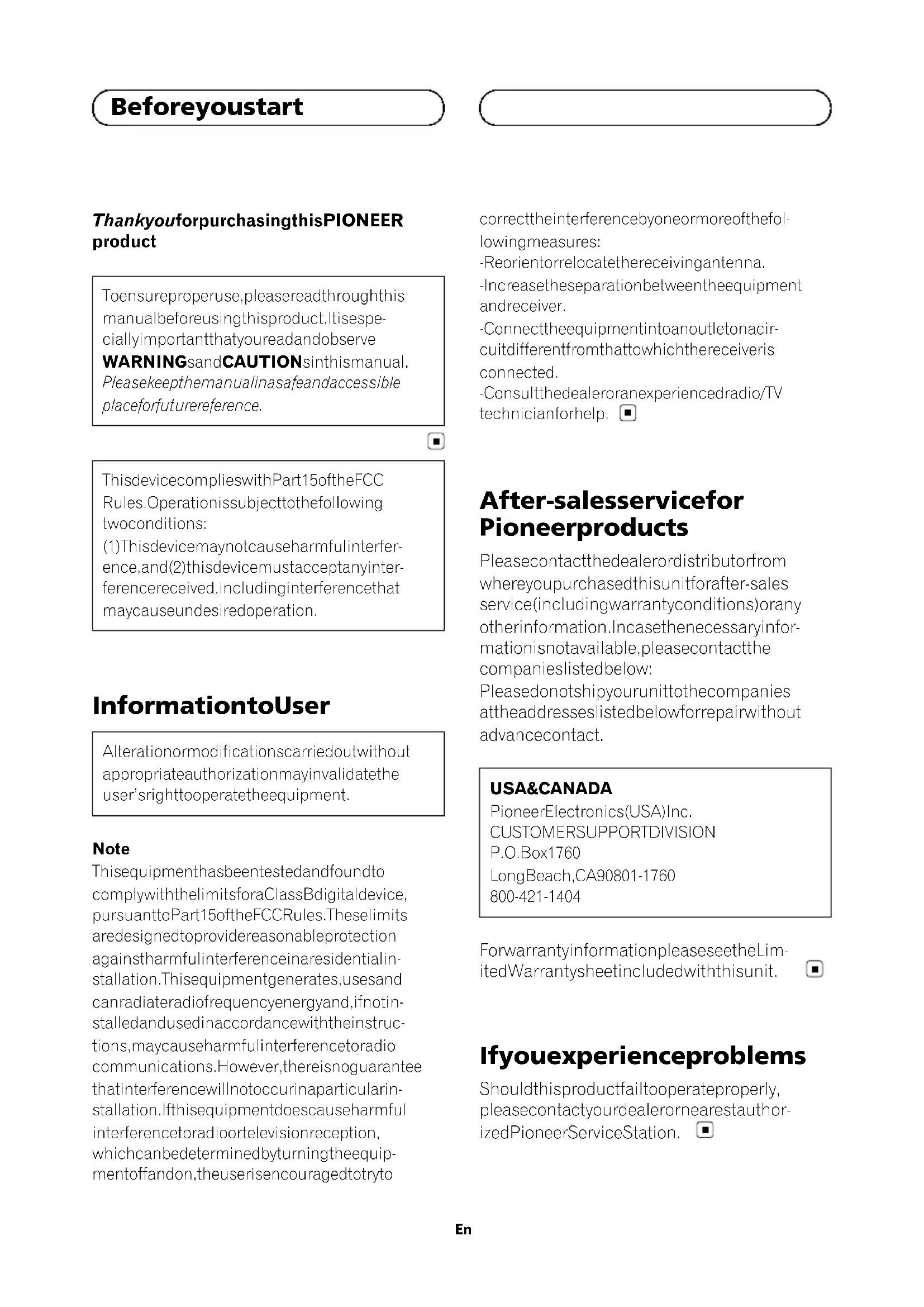 P.O. Box 1760 Long Beach, CA 90801-1760 800-421-1404 For warranty information please see the Lim- ited Warranty sheet included with this unit. If you experience problems Should this product fail to operate properly, please contact your dealer or nearest author- ized Pioneer Service Station.