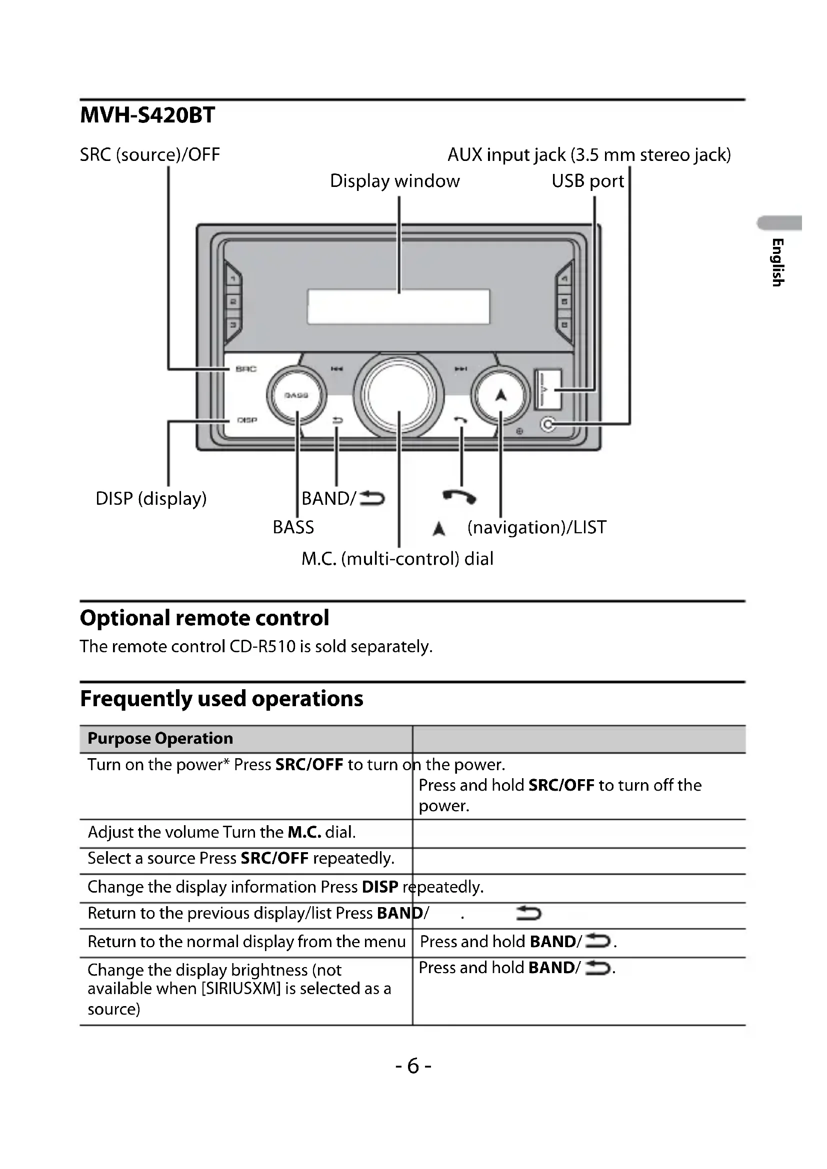 SRC (source)/OFF Display window M.C. (multi-control) dial BAND/ DISP (display) (navigation)/LIST USB port AUX input jack (3.5 mm stereo jack) BASS- 6 - English MVH-S420BT Optional remote control The remote control CD-R510 is sold separately. Frequently used operations Purpose Operation Turn on the power* Press SRC/OFF to turn on the power. Press and hold SRC/OFF to turn off the power. Adjust the volume Turn the M.C. dial. Select a source Press SRC/OFF repeatedly. Change the display information Press DISP repeatedly. Return to the previous display/list Press BAND/. Return to the normal display from the menu Press and hold BAND/. Change the display brightness (not available when [SIRIUSXM] is selected as a source) Press and hold BAND/. SRC (source)/OFF Display window M.C. (multi-control) dial BAND/ DISP (display) (navigation)/LIST USB port AUX input jack (3.5 mm stereo jack) BASS- 7 -- 7 - English