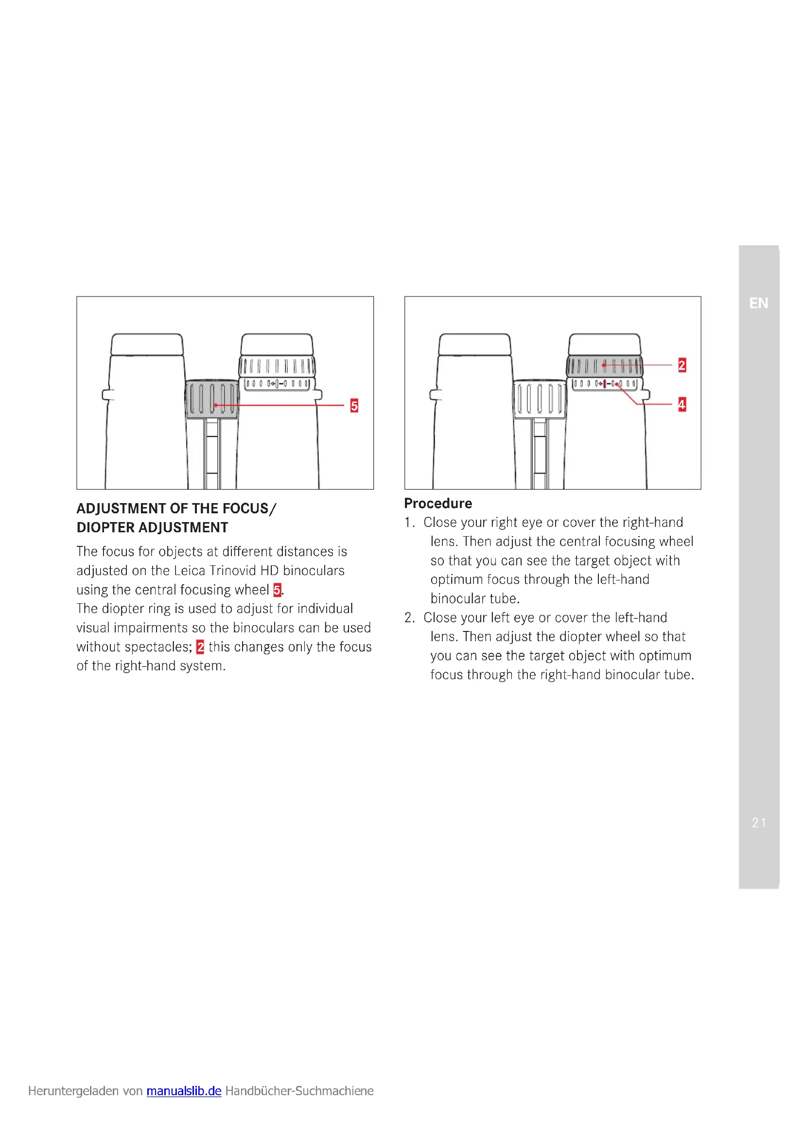 The user's individual value determined using the focus adjustment can then be adjusted again within seconds using the scale setting that has been determined once. CARE/CLEANING Your Leica Trinovid HD binoculars have been designed for constant use outdoors. No particu- lar care is needed other than occasional cleaning. Fingerprints, droplets of water, etc. on lenses and eyepieces can be wiped off using a soft, lint-free cloth. Breathing on the lenses beforehand may help. Coarse soiling on the glass surfaces, such as sand, should be removed using a fine brush or blown off. In the case of severe soiling, the binoculars may be cleaned by rinsing them under running water that is hand-hot at most. Salt water should also be washed off. Alcohol or other chemical solutions may not be used for cleaning. Heruntergeladen von manualslib.de Handbücher-SuchmachieneEN