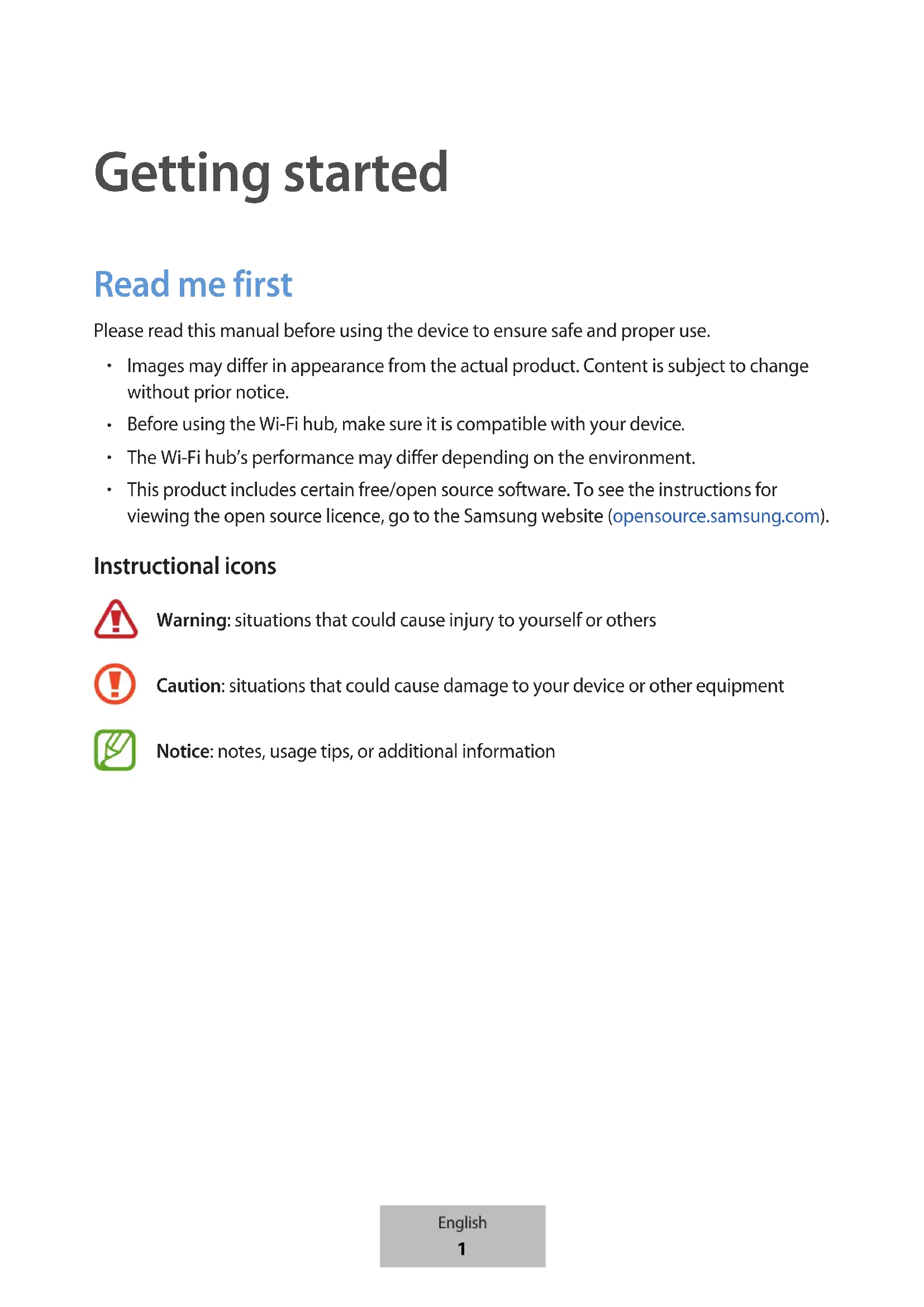 This product includes certain free/open source software. To see the instructions for viewing the open source licence, go to the Samsung website (opensource.samsung.com). Instructional icons