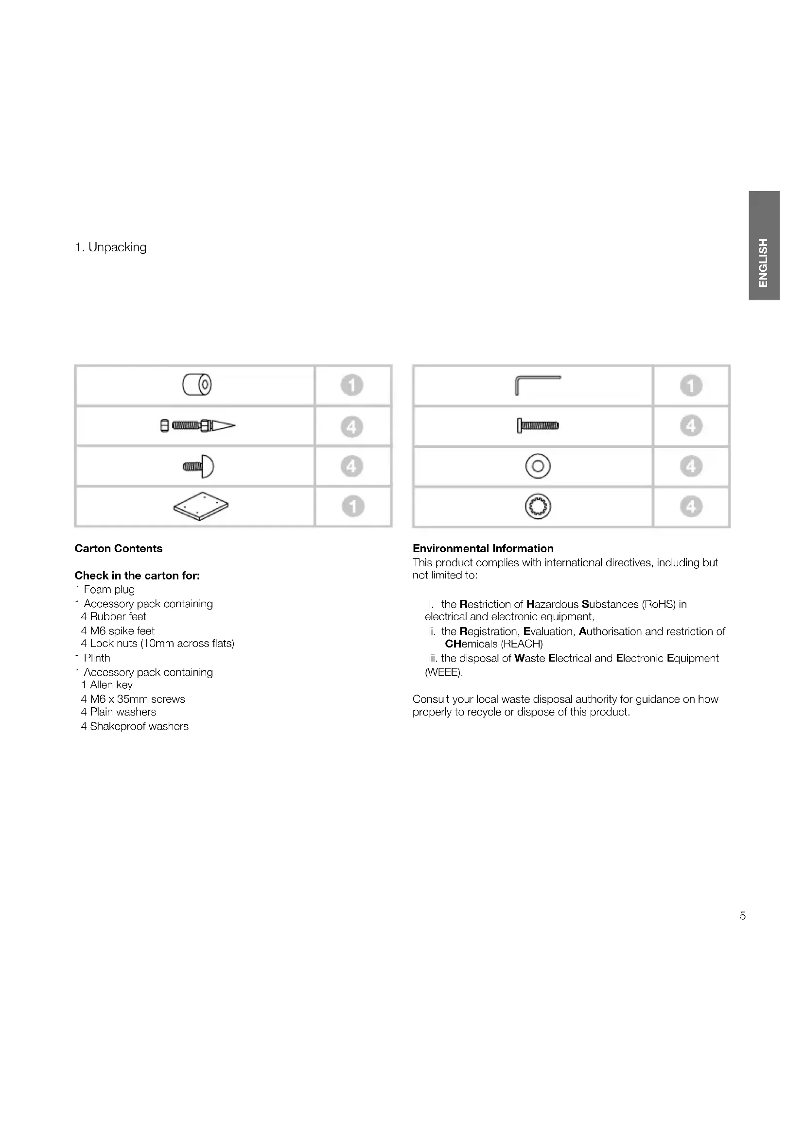Carton Contents Check in the carton for: 1 Foam plug 1 Accessory pack containing 4 Rubber feet 4 M6 spike feet 4 Lock nuts (10mm across ats) 1 Plinth 1 Accessory pack containing 1 Allen key 4 M6 x 35mm screws 4 Plain washers 4 Shakeproof washers Environmental Information This product complies with international directives, including but not limited to: