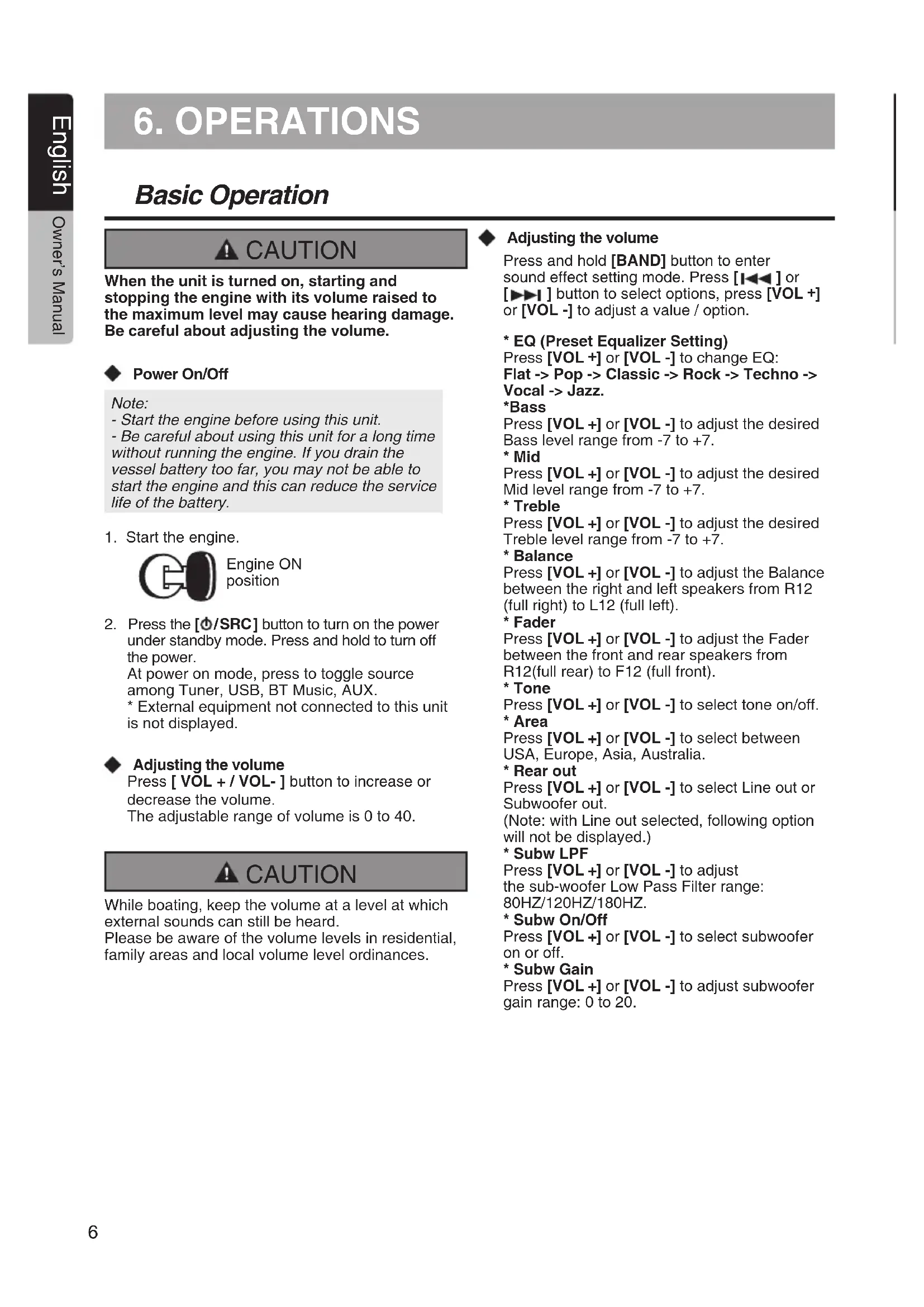 under standby mode. Press and hold to turn off the power.At power on mode, press to toggle source among Tuner, USB, BT Music, AUX.* External equipment not connected to this unit is not displayed. Adjusting the volumePress [ VOL + / VOL- ] button to increase or decrease the volume.The adjustable range of volume is 0 to 40. CAUTION While boating, keep the volume at a level at which external sounds can still be heard.Please be aware of the volume levels in residential, family areas and local volume level ordinances. Adjusting the volumePress and hold [BAND] button to enter sound effect setting mode. Press [ ] or ] button to select options, press [VOL ] or [VOL -] to adjust a value / option.* EQ (Preset Equalizer Setting)Press [VOL ] or [VOL -] to change EQ:Flat -> Pop -> Classic -> Rock -> Techno -> Vocal -> Jazz.*BassPress [VOL ] or [VOL -] to adjust the desired Bass level range from -7 to +7.* MidPress [VOL ] or [VOL -] to adjust the desired Mid level range from -7 to +7.* TreblePress [VOL ] or [VOL -] to adjust the desired Treble level range from -7 to +7.* BalancePress [VOL ] or [VOL -] to adjust the Balance between the right and left speakers from R12 (full right) to L12 (full left).* FaderPress [VOL ] or [VOL -] to adjust the Fader between the front and rear speakers from R12(full rear) to F12 (full front).* TonePress [VOL ] or [VOL -] to select tone on/off.* AreaPress [VOL ] or [VOL -] to select between USA, Europe, Asia, Australia.* Rear outPress [VOL ] or [VOL -] to select Line out or Subwoofer out.(Note: with Line out selected, following option will not be displayed.)* Subw LPFPress [VOL ] or [VOL -] to adjust the sub-woofer Low Pass Filter range: 80HZ/120HZ/180HZ.* Subw On/OffPress [VOL ] or [VOL -] to select subwoofer on or off.* Subw GainPress [VOL ] or [VOL -] to adjust subwoofer gain range: 0 to 20. Basic Operation