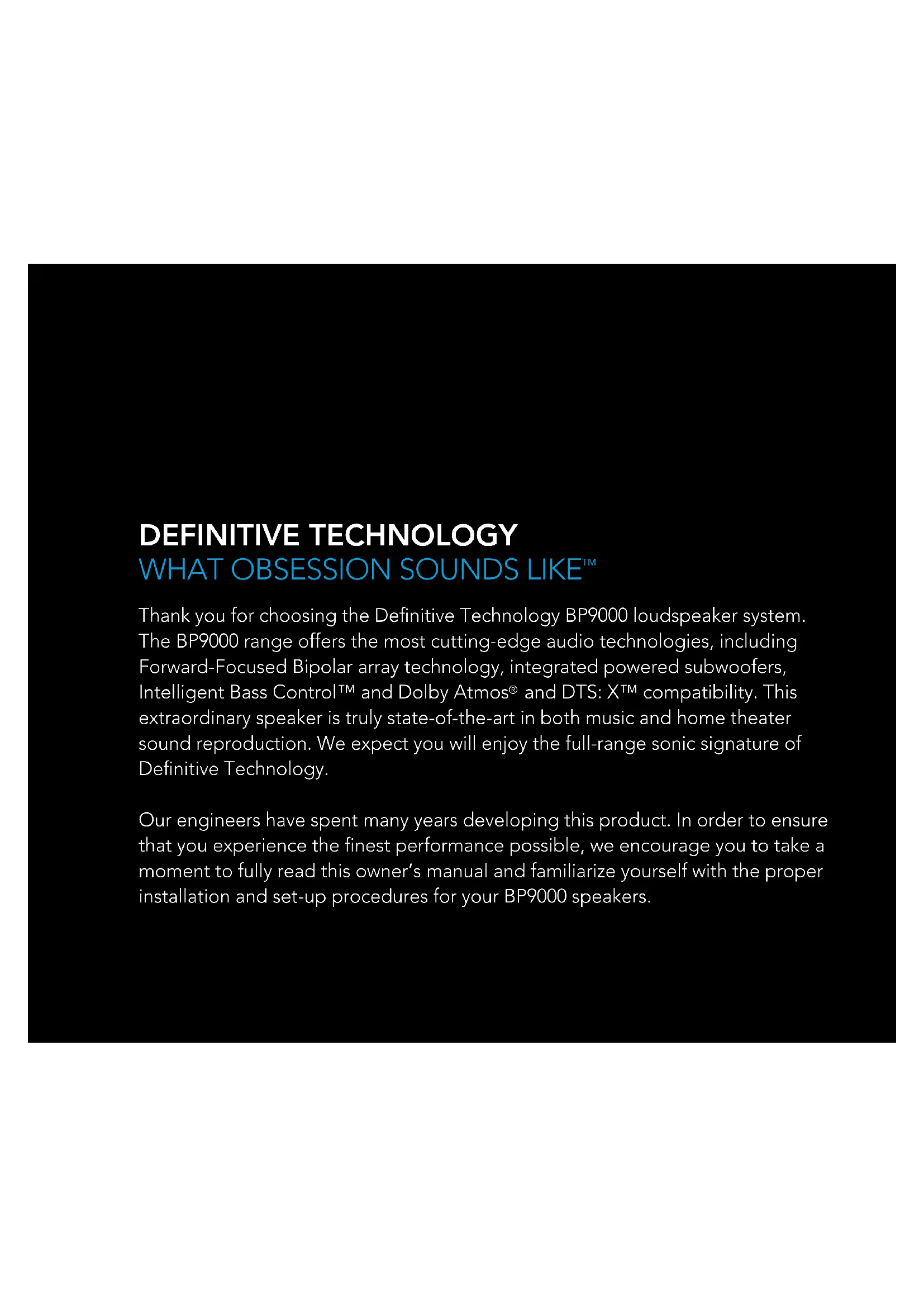 Thank you for choosing the Definitive Technology BP9000 loudspeaker system. The BP9000 range offers the most cutting-edge audio technologies, including Forward-Focused Bipolar array technology, integrated powered subwoofers, Intelligent Bass Control™ and Dolby Atmos