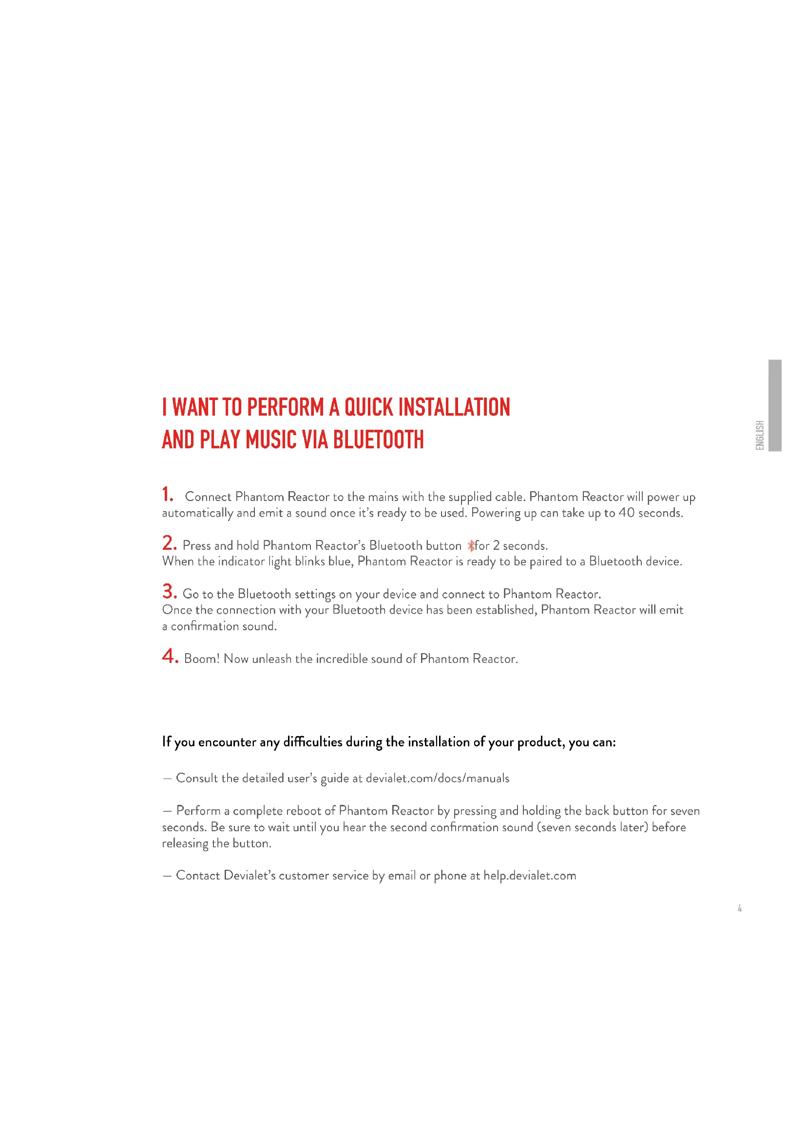— Consult the detailed user’s guide at devialet.com/docs/manuals — Perform a complete reboot of Phantom Reactor by pressing and holding the back button for seven seconds. Be sure to wait until you hear the second conrmation sound (seven seconds later) before releasing the button. — Contact Devialet’s customer service by email or phone at help.devialet.com5