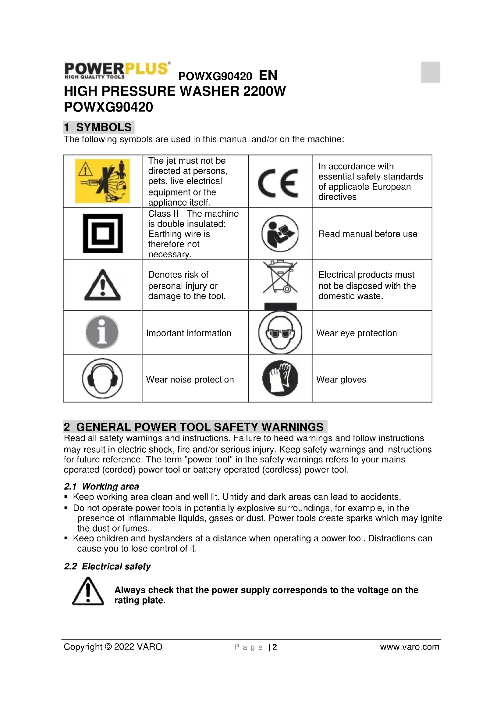 plastic bags! Danger of suffocation! 1x high pressure washer 1x trigger 1x extended lance for gun 1x adjustable nozzle 1x water inlet connector 1x 8 m pressure hose 1x manual 1x patio cleaner 1x turbo nozzle 1x cleaning needle When parts are missing or damaged, please contact your dealer.POWXG90420 EN Copyright © 2022 VARO P a g e | 3 www.varo.com