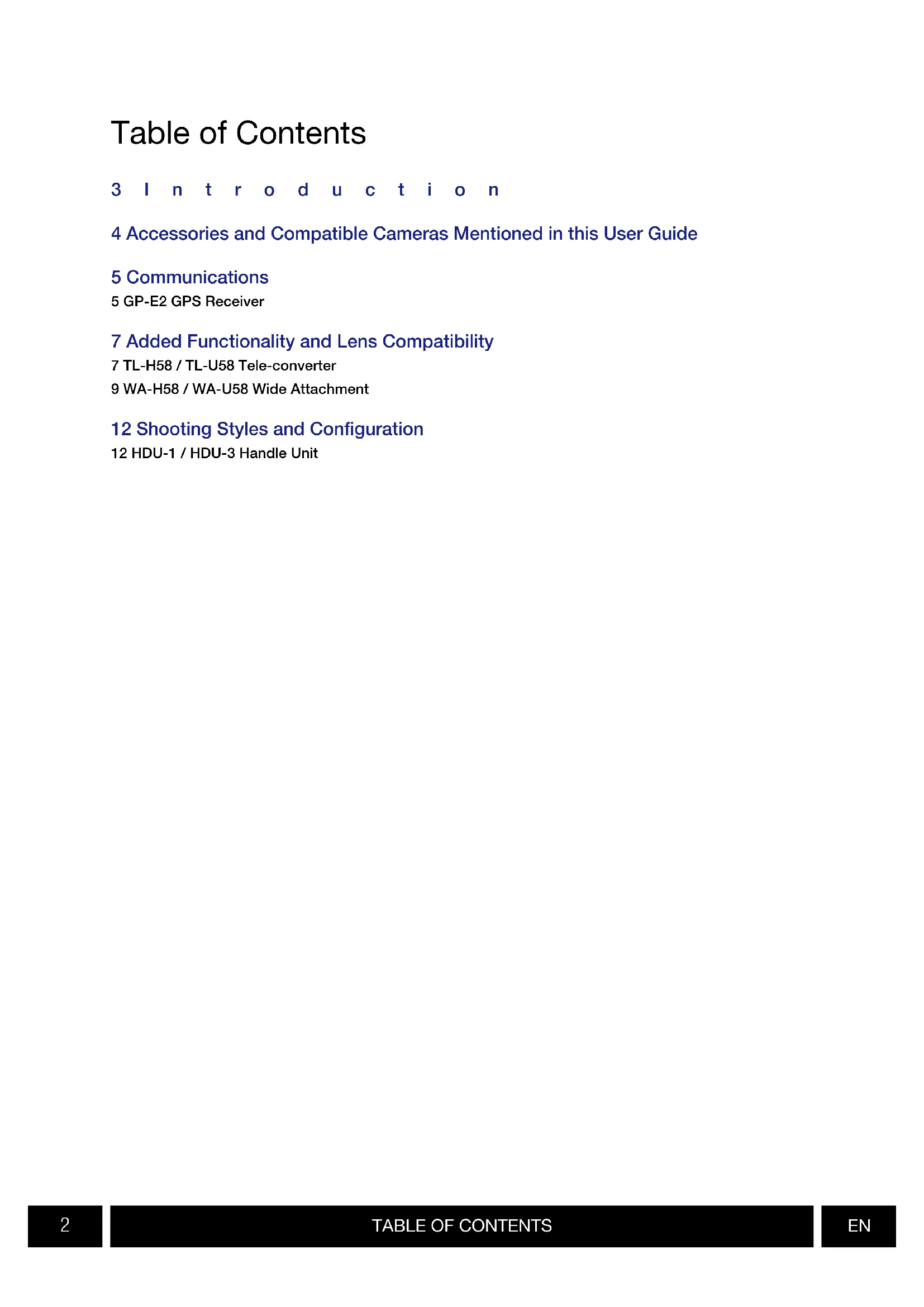 3Introduction 4 Accessories and Compatible Cameras Mentioned in this User Guide 5 Communications 5 GP-E2 GPS Receiver 7 Added Functionality and Lens Compatibility 7 TL-H58 / TL-U58 Tele-converter 9 WA-H58 / WA-U58 Wide Attachment 12 Shooting Styles and Configuration 12 HDU-1 / HDU-3 Handle Unit Table of ContentsINTRODUCTION