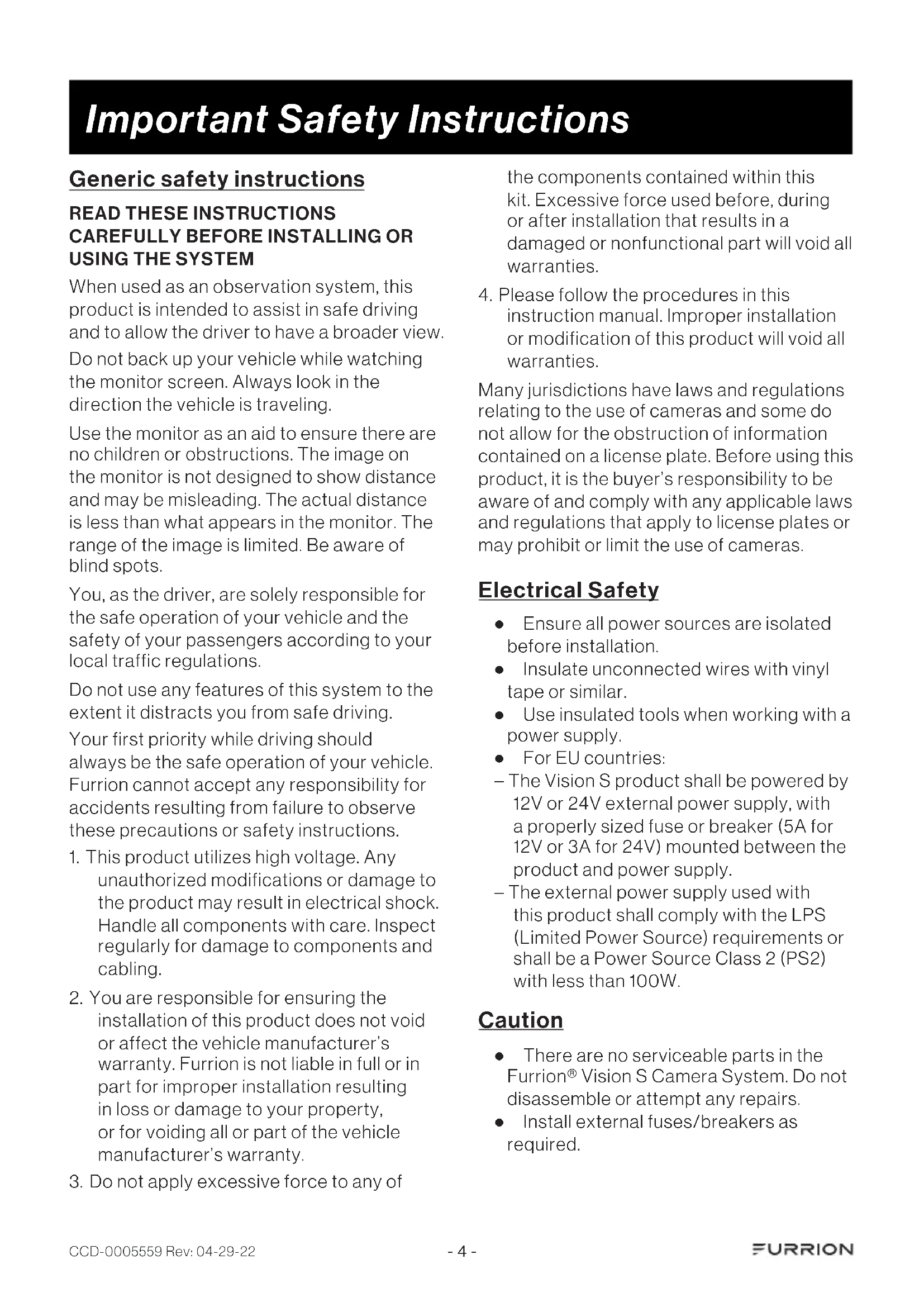 instruction manual. Improper installation or modification of this product will void all warranties. Many jurisdictions have laws and regulations relating to the use of cameras and some do not allow for the obstruction of information contained on a license plate. Before using this product, it is the buyer’s responsibility to be aware of and comply with any applicable laws and regulations that apply to license plates or may prohibit or limit the use of cameras. Electrical Safety ● Ensure all power sources are isolated before installation. ● Insulate unconnected wires with vinyl tape or similar. ● Use insulated tools when working with a power supply. ● For EU countries: − The Vision S product shall be powered by 12V or 24V external power supply, with a properly sized fuse or breaker (5A for 12V or 3A for 24V) mounted between the product and power supply. − The external power supply used with this product shall comply with the LPS (Limited Power Source) requirements or shall be a Power Source Class 2 (PS2) with less than 100W. Caution ● There are no serviceable parts in the Furrion® Vision S Camera System. Do not disassemble or attempt any repairs. ● Install external fuses/breakers as required.CCD-0005559 Rev: 04-29-22