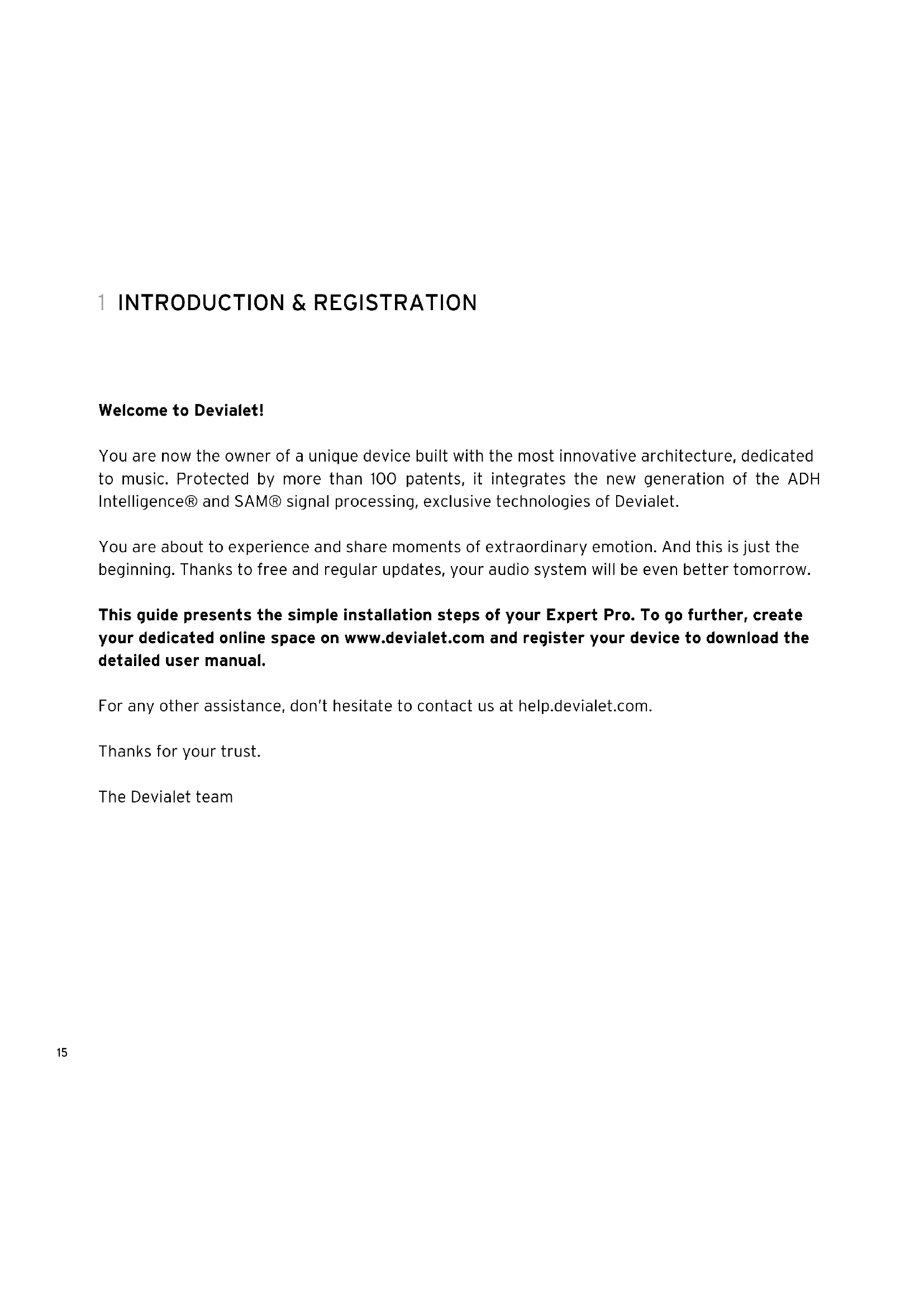 p. 16 p. 18 p. 21 p. 22 p. 22 p. 23 p. 2415 1 INTRODUCTION & REGISTRATION Welcome to Devialet! You are now the owner of a unique device built with the most innovative architecture, dedicated to music. Protected by more than 100 patents, it integrates the new generation of the ADH Intelligence® and SAM® signal processing, exclusive technologies of Devialet. You are about to experience and share moments of extraordinary emotion. And this is just the beginning. Thanks to free and regular updates, your audio system will be even better tomorrow. This guide presents the simple installation steps of your Expert Pro. To go further, create your dedicated online space on www.devialet.com and register your device to download the detailed user manual. For any other assistance, don’t hesitate to contact us at help.devialet.com. Thanks for your trust. The Devialet teamEnglish