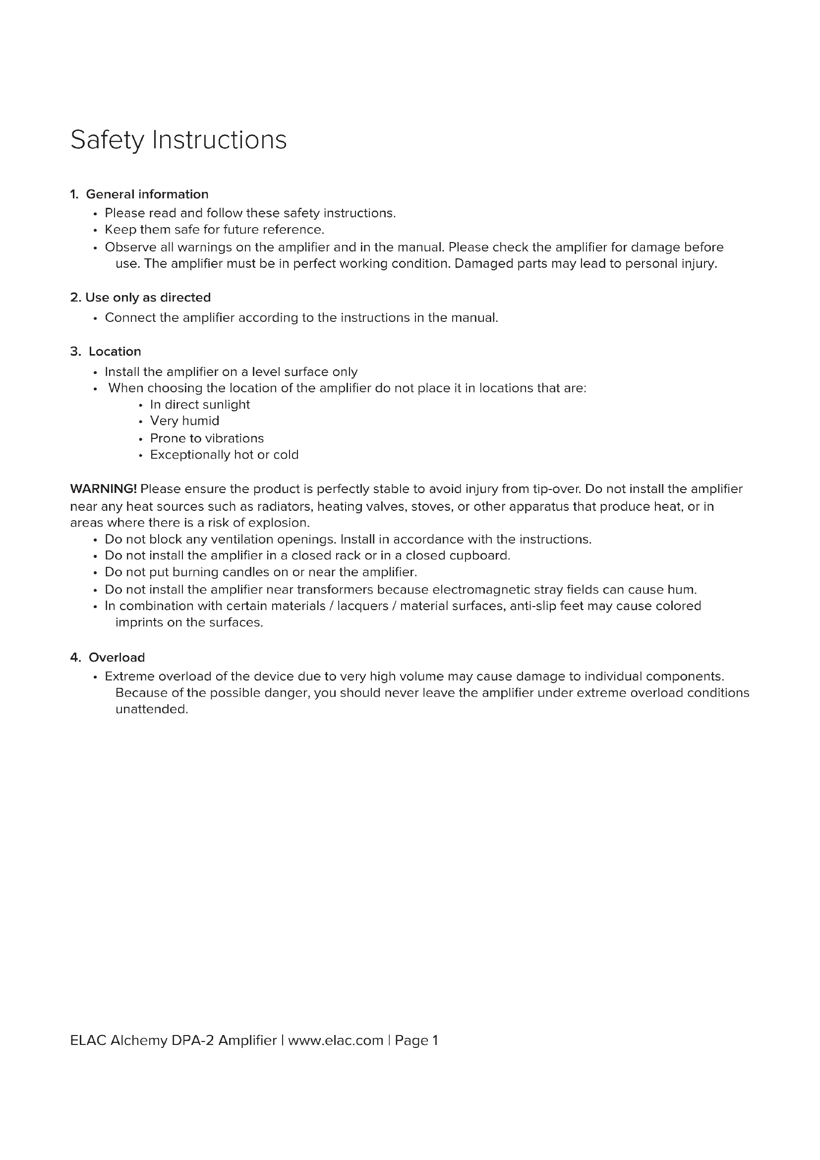 - Extreme overload of the device due to very high volume may cause damage to individual components. Because of the possible danger, you should never leave the amplifier under extreme overload conditions unattended.ELAC Alchemy DPA-2 Amplifier | www.elac.com | Page 2
