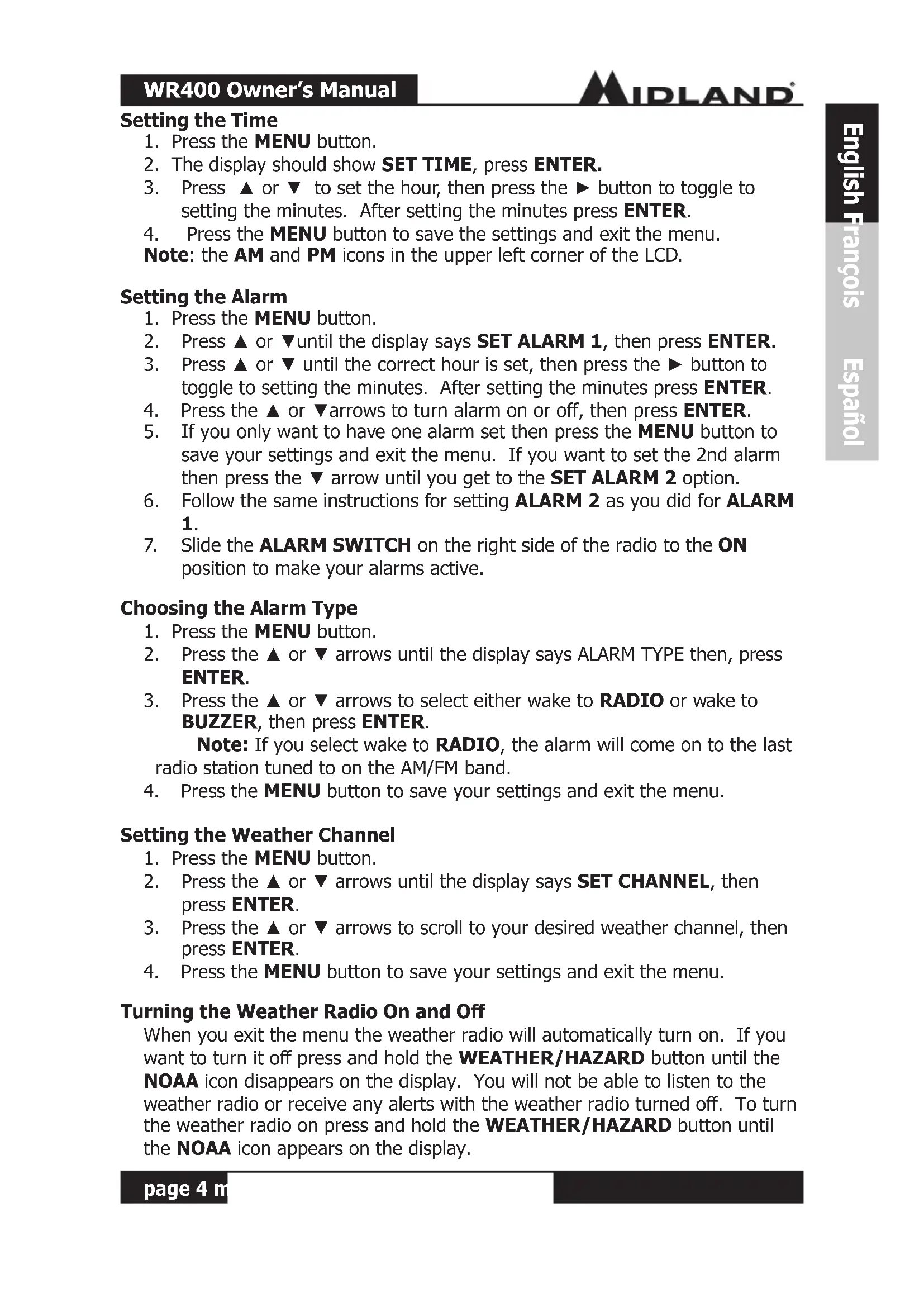 Turning the Weather Radio On and O When you exit the menu the weather radio will automatically turn on. If you want to turn it o press and hold the WEATHER/HAZARD button until the NOAA icon disappears on the display. You will not be able to listen to the weather radio or receive any alerts with the weather radio turned o. To turn the weather radio on press and hold the WEATHER/HAZARD button until the NOAA icon appears on the display.WR400 Owner’s Manual page 5 midlandusa.com English François Español Setting Your Location
