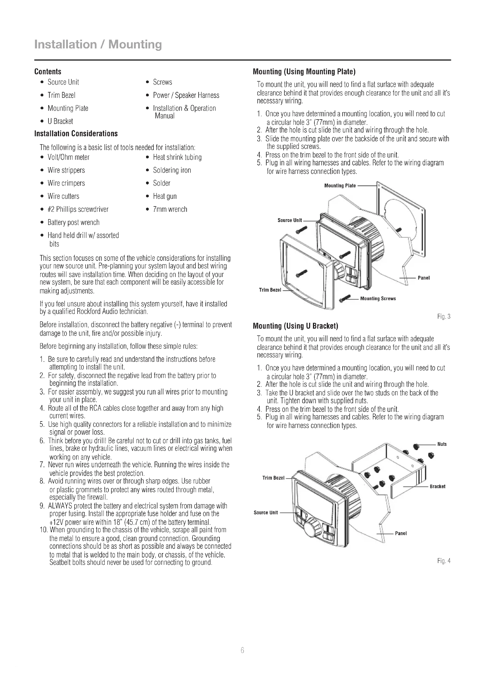 FILTER & FUSE BOX Fig. 26 Installation / Mounting Contents Installation Considerations The following is a basic list of tools needed for installation: This section focuses on some of the vehicle considerations for installing your new source unit. Pre-planning your system layout and best wiring routes will save installation time. When deciding on the layout of your new system, be sure that each component will be easily accessible for making adjustments. If you feel unsure about installing this system yourself, have it installed by a qualified Rockford Audio technician. Before installation, disconnect the battery negative (-) terminal to prevent damage to the unit, fire and/or possible injury. Before beginning any installation, follow these simple rules: