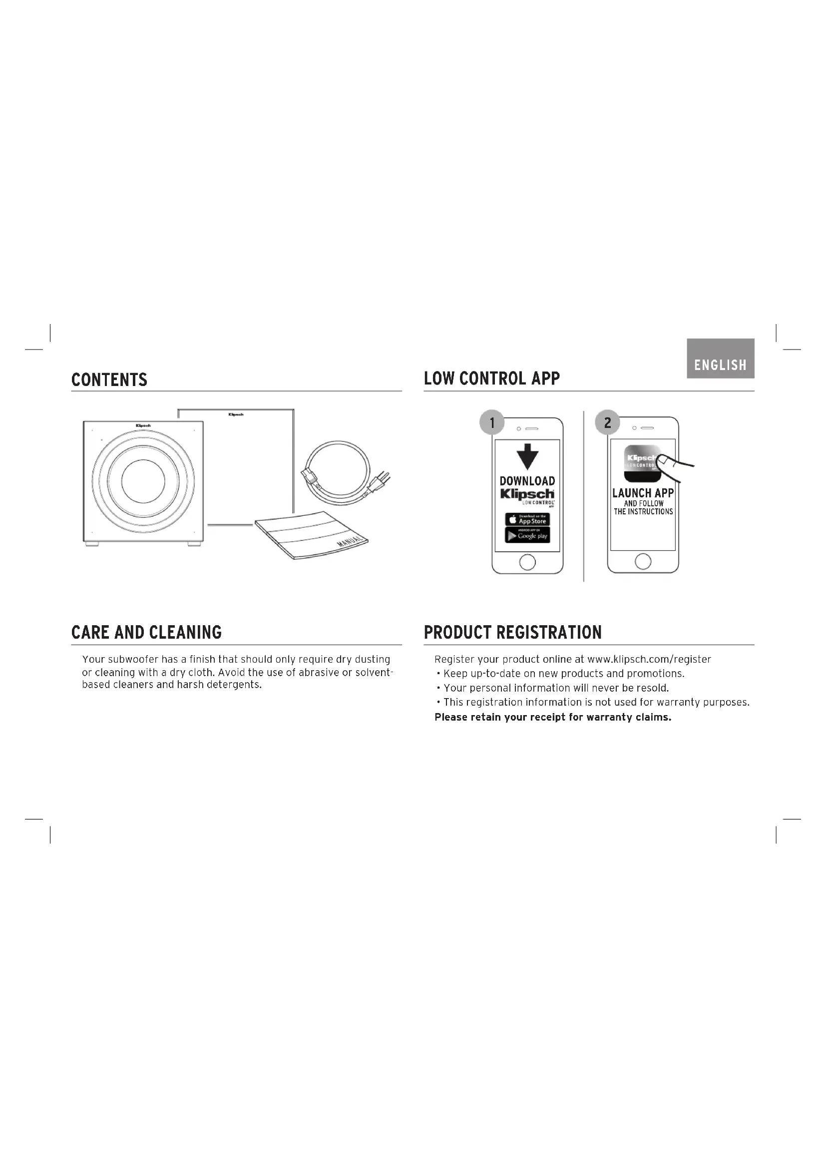 Register your product online at www.klipsch.com/register• Keep up-to-date on new products and promotions.• Your personal information will never be resold.• This registration information is not used for warranty purposes. Please retain your receipt for warranty claims. PRODUCT REGISTRATION