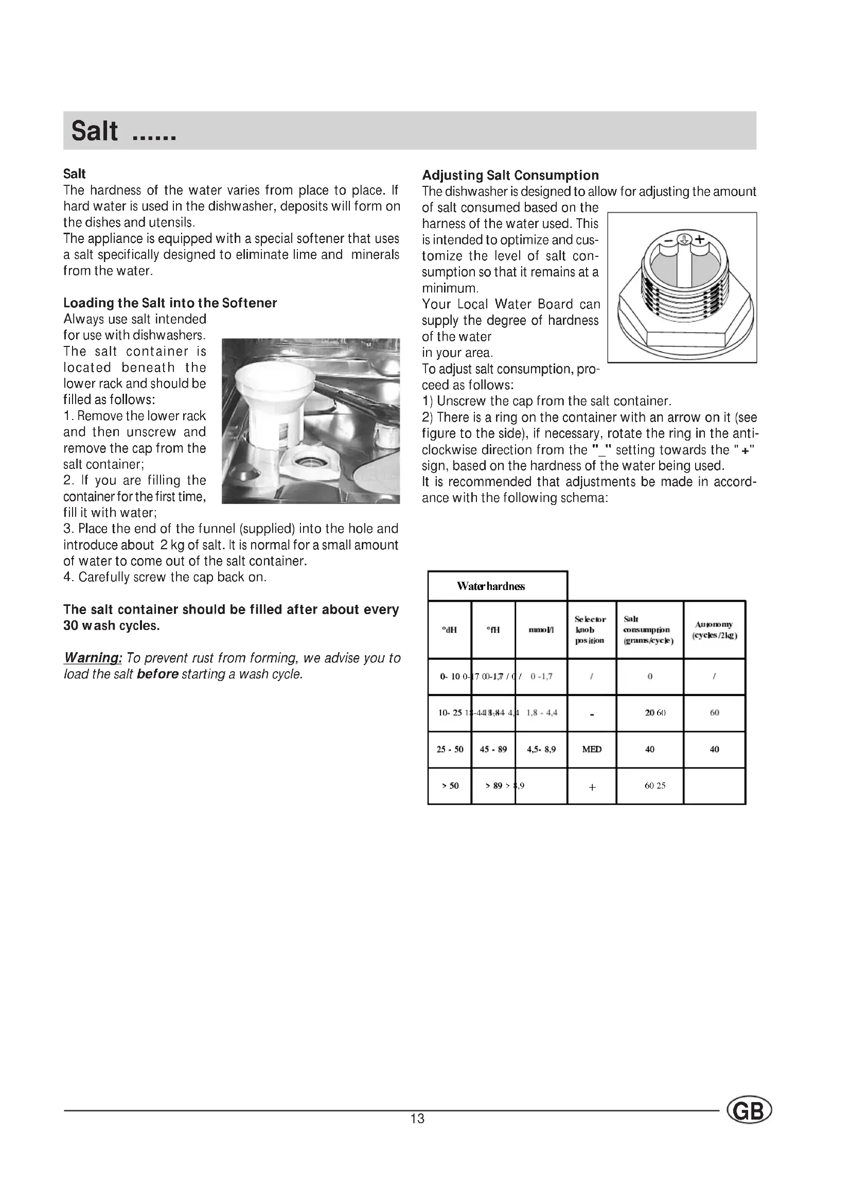 load the salt before starting a wash cycle. Adjusting Salt Consumption The dishwasher is designed to allow for adjusting the amount of salt consumed based on the harness of the water used. This is intended to optimize and cus- tomize the level of salt con- sumption so that it remains at a minimum. Your Local Water Board can supply the degree of hardness of the water in your area. To adjust salt consumption, pro- ceed as follows: