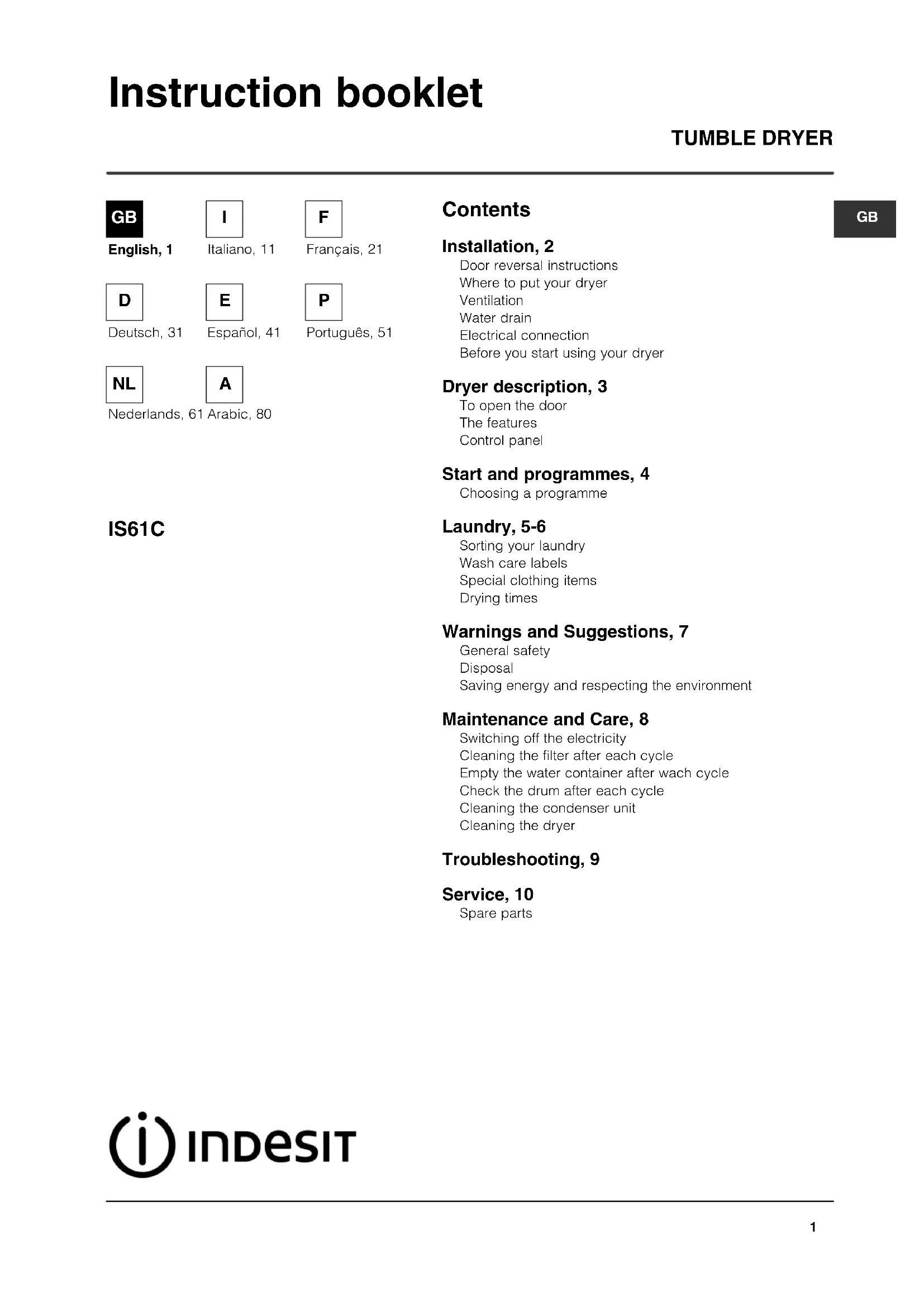 Contents TUMBLE DRYER IS61C Instruction booklet Installation, 2 Door reversal instructions Where to put your dryer Ventilation Water drain Electrical connection Before you start using your dryer Dryer description, 3 To open the door The features Control panel Start and programmes, 4 Choosing a programme Laundry, 5-6 Sorting your laundry Wash care labels Special clothing items Drying times Warnings and Suggestions, 7 General safety Disposal Saving energy and respecting the environment Maintenance and Care, 8 Switching off the electricity Cleaning the filter after each cycle Empty the water container after wach cycle Check the drum after each cycle Cleaning the condenser unit Cleaning the dryer Troubleshooting, 9 Service, 10 Spare parts