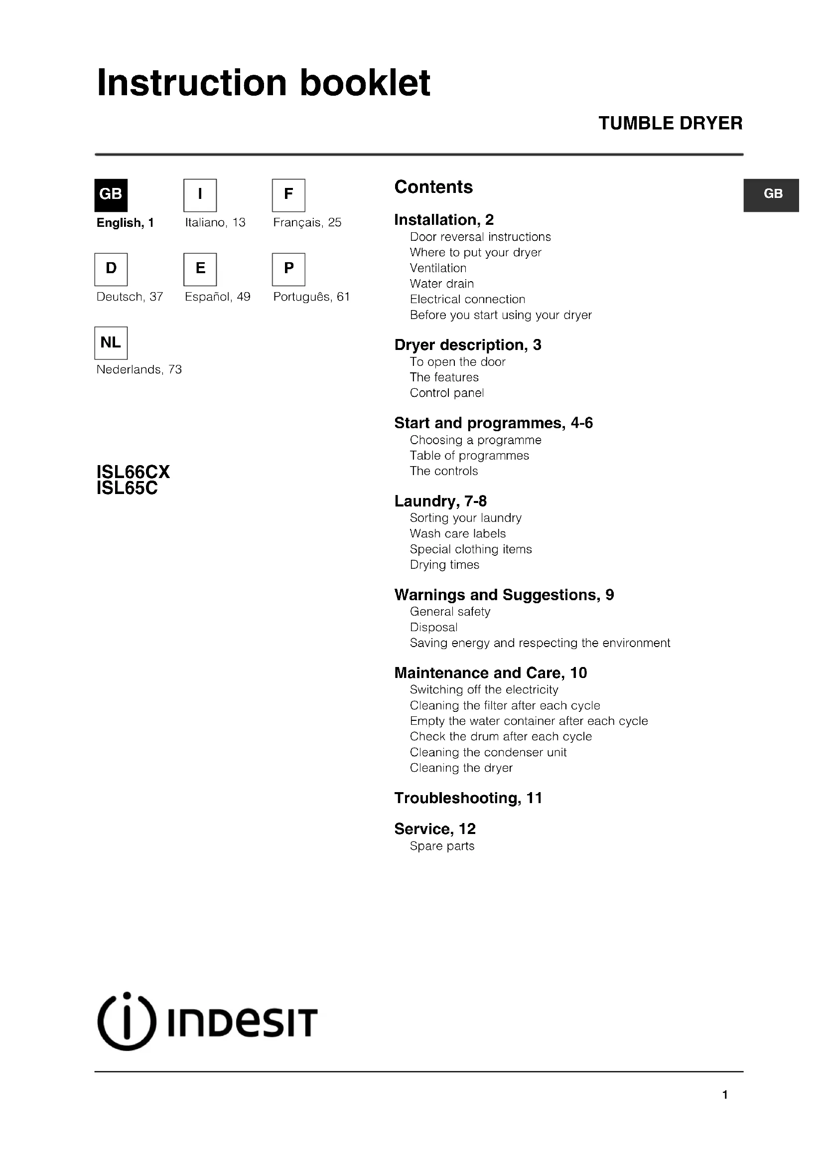 Contents TUMBLE DRYER ISL66CX ISL65C Instruction booklet Installation, 2 Door reversal instructions Where to put your dryer Ventilation Water drain Electrical connection Before you start using your dryer Dryer description, 3 To open the door The features Control panel Start and programmes, 4-6 Choosing a programme Table of programmes The controls Laundry, 7-8 Sorting your laundry Wash care labels Special clothing items Drying times Warnings and Suggestions, 9 General safety Disposal Saving energy and respecting the environment Maintenance and Care, 10 Switching off the electricity Cleaning the filter after each cycle Empty the water container after each cycle Check the drum after each cycle Cleaning the condenser unit Cleaning the dryer Troubleshooting, 11 Service, 12 Spare parts