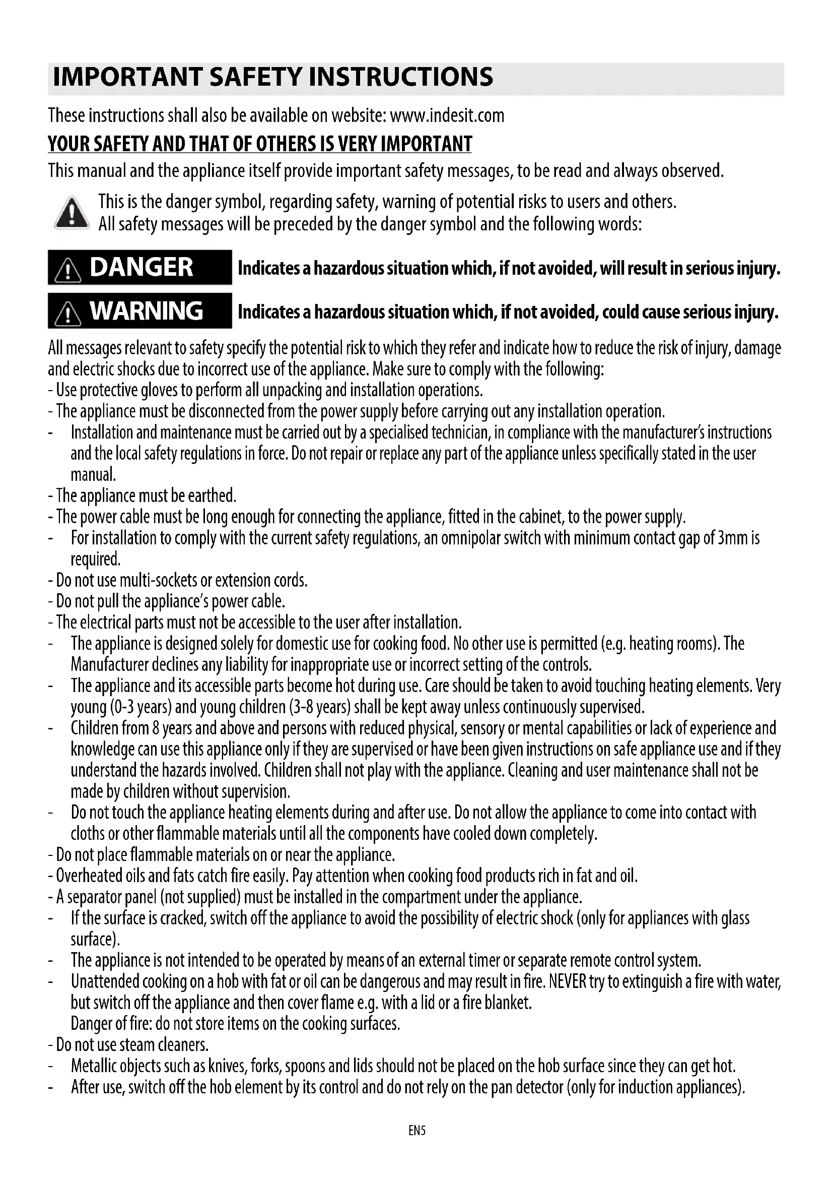 5 6EN5 These instructions shall also be available on website: www.indesit.com YOUR SAFETY AND THAT OF OTHERS IS VERY IMPORTANT This manual and the appliance itself provide important safety messages, to be read and always observed. All messages relevant to safety specify the potential risk to which they refer and indicate how to reduce the risk of injury, damage and electric shocks due to incorrect use of the appliance. Make sure to comply with the following: - Use protective gloves to perform all unpacking and installation operations. - The appliance must be disconnected from the power supply before carrying out any installation operation. - Installation and maintenance must be carried out by a specialised technician, in compliance with the manufacturer’s instructions and the local safety regulations in force. Do not repair or replace any part of the appliance unless specifically stated in the user manual. - The appliance must be earthed. - The power cable must be long enough for connecting the appliance, fitted in the cabinet, to the power supply. - For installation to comply with the current safety regulations, an omnipolar switch with minimum contact gap of 3mm is required. - Do not use multi-sockets or extension cords. - Do not pull the appliance’s power cable. - The electrical parts must not be accessible to the user after installation. - The appliance is designed solely for domestic use for cooking food. No other use is permitted (e.g. heating rooms). The Manufacturer declines any liability for inappropriate use or incorrect setting of the controls. - The appliance and its accessible parts become hot during use. Care should be taken to avoid touching heating elements. Very young (0-3 years) and young children (3-8 years) shall be kept away unless continuously supervised. - Children from 8 years and above and persons with reduced physical, sensory or mental capabilities or lack of experience and knowledge can use this appliance only if they are supervised or have been given instructions on safe appliance use and if they understand the hazards involved. Children shall not play with the appliance. Cleaning and user maintenance shall not be made by children without supervision. - Do not touch the appliance heating elements during and after use. Do not allow the appliance to come into contact with cloths or other flammable materials until all the components have cooled down completely. - Do not place flammable materials on or near the appliance. - Overheated oils and fats catch fire easily. Pay attention when cooking food products rich in fat and oil. - A separator panel (not supplied) must be installed in the compartment under the appliance. - If the surface is cracked, switch off the appliance to avoid the possibility of electric shock (only for appliances with glass surface). - The appliance is not intended to be operated by means of an external timer or separate remote control system. - Unattended cooking on a hob with fat or oil can be dangerous and may result in fire. NEVER try to extinguish a fire with water, but switch off the appliance and then cover flame e.g. with a lid or a fire blanket. Danger of fire: do not store items on the cooking surfaces. - Do not use steam cleaners. - Metallic objects such as knives, forks, spoons and lids should not be placed on the hob surface since they can get hot. - After use, switch off the hob element by its control and do not rely on the pan detector (only for induction appliances).