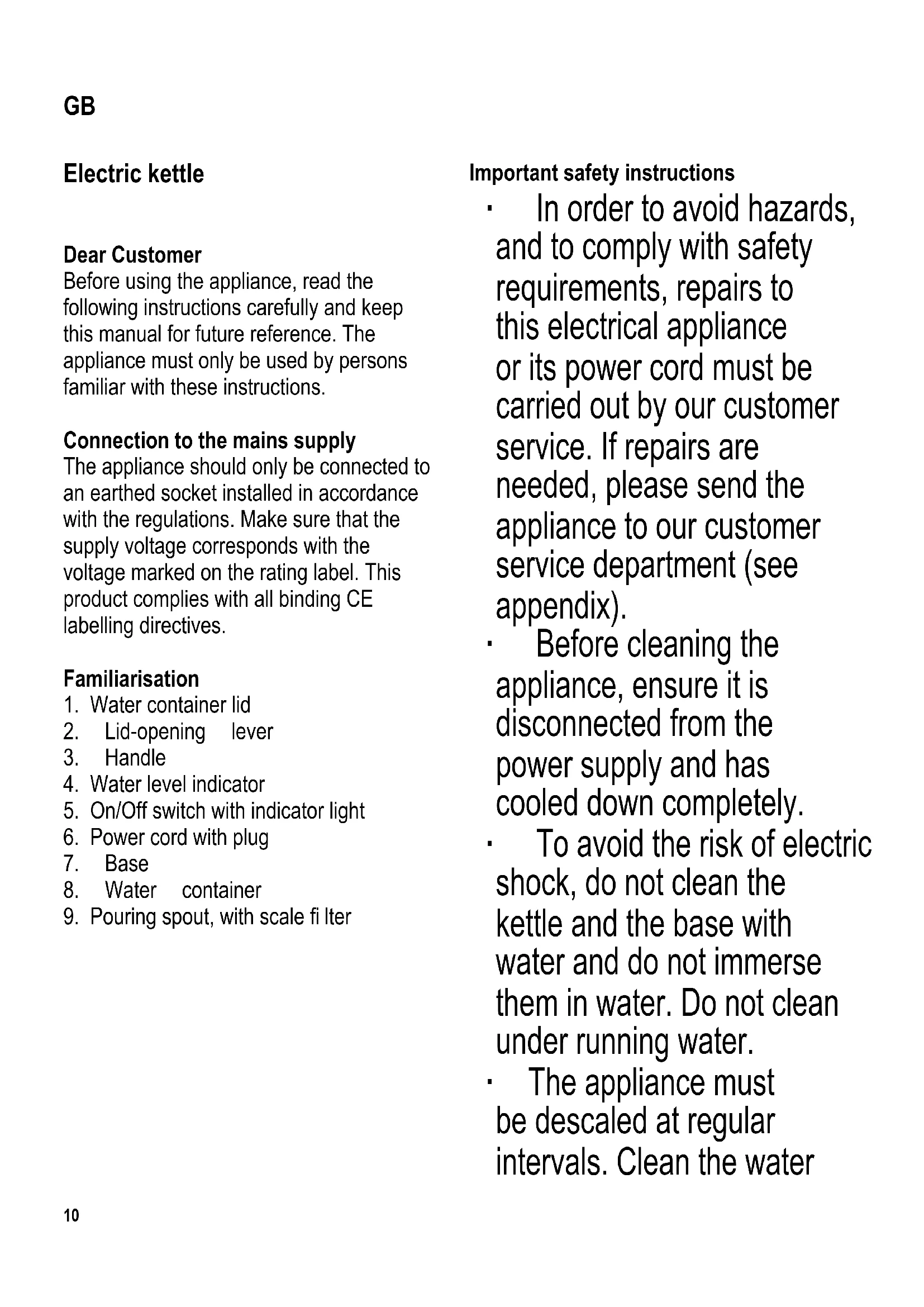 Important safety instructions ∙ In order to avoid hazards, and to comply with safety requirements, repairs to this electrical appliance or its power cord must be carried out by our customer service. If repairs are needed, please send the appliance to our customer service department (see appendix). ∙ Before cleaning the appliance, ensure it is disconnected from the power supply and has cooled down completely. ∙ To avoid the risk of electric shock, do not clean the kettle and the base with water and do not immerse them in water. Do not clean under running water. ∙ The appliance must be descaled at regular intervals. Clean the water GB11 container as necessary with a damp cloth. ∙ Detailed information on cleaning the appliance can be found in the section Cleaning and care. ∙ This appliance may be used by children (at least 8 years of age) and by persons with reduced physical, sensory or mental capabilities, or lacking experience and knowledge, provided they have been given supervision or instruction concerning the use of the appliance and fully understand all dangers and safety precautions involved. ∙ Children must not be permitted to play with the appliance. ∙ Children must not be permitted to carry out any cleaning or maintenance work on the appliance unless they are supervised and at least 8 years of age. ∙ The appliance and its power cord must be kept well away from children under 8 at all times. ∙ This appliance is intended for domestic or similar applications, such as - in staff kitchens in shops, offi ces and other similar working environments, - in agricultural working environments, - by customers in hotels, motels etc. and similar accommodation, - in bed-and breakfast type environments. ∙ The exterior surfaces become hot during use and will remain so for some time afterwards. ∙ Do not leave the kettle unattended during12 operation. Use only pure water when fi lling the container to the desired level, observing the Min. (0.5 l) and Max. (1.7 l) markings on the water level indicator. Overfi lling the container may cause danger from boiling water being forced out. ∙ Also beware of the danger of scalding from hot steam being emitted. Therefore, do not touch any parts of the appliance except the handle during use. ∙ Caution! During the boiling process and when pouring out hot water, the lid must be kept closed at all times. ∙ The kettle may only be operated with the base provided with the appliance. ∙ Never remove the water container from the base (or replace it) while the appliance is switched on. ∙ If the water container is not on its base, ensure that it cannot slip on any smooth surface. ∙ The electrical connections in the base must be protected at all times against possible contact with water. ∙ Caution: Any misuse of the appliance can cause severe personal injury. ∙ Caution: Keep any packaging materials well away from children – such materials are a potential source of danger, e.g. of suffocation. ∙ Every time the appliance is used, the main body including the power cord as well as any attachment fi tted should be checked thoroughly for any defects. Should the appliance, for instance, have been dropped onto a hard surface, or if excessive force has been used to pull the power cord, it must no longer be used: even invisible damage may have adverse effects on the operational safety of the appliance. ∙ The appliance must be used only on a heat-resistant, level surface. ∙ Do not operate the appliance below13 a hanging cupboard or similar object; there is a risk that escaping steam may be trapped underneath. ∙ Do not allow the appliance or its power cord to come into contact with open fl ames or any hot surfaces such as hot- plates. ∙ Do not let the power cord hang free, and keep the cord well away from hot parts of the housing. ∙ Take special care when you carry the container with hot water in. ∙ Always remove the plug from the wall socket, - in case of any malfunction, - after use, - during cleaning. Intended use ∙ This appliance is solely designed for heating clean, fresh water. Any other form of use must be considered improper and may lead to personal injuries or material damage. ∙ It is not suitable for heating milk, tea or other food or beverages. Thermal safety cut-out The pre-set thermal safety cut-out protects the heating element from overheating should the appliance be erroneously switched on without any water, or if the heating plate is calcifi ed. Once the safety cut-out has switched off the kettle, it must be allowed to cool down suffi ciently, or must be descaled before it is switched on again. Before using for the fi rst time To clean the kettle, boil and discard the fi rst fi lling of water. Boiling water ∙ Remove the water container from its base. ∙ Press the lid-opener on the handle to open the lid, and fi ll the container with water to the desired level, observing the Min (0.5 l) and Max (1.7 l) markings. ∙ Close the lid and place the container back on its base. ∙ Insert the plug into a suitable wall socket and press the On/Off switch; the indicator light comes on. ∙ The boiling process begins. After reaching the boiling point, the appliance is automatically switched off by the integral steam cut-off device; the indicator light goes out. ∙ To interrupt the boiling process, set the On/Off switch to its Off position. ∙ To pour hot water, remove the container from its base. ∙ To prevent hot steam from being emitted, ensure that the lid remains closed while pouring out the water. ∙ Remove the plug from the wall outlet after use (the red indicator light goes out). ∙ Do not leave any residual water in the container. Power cord wind-up storage The wind-up power cord storage under the base facilitates limiting the length of the power cord during use and makes it easy to store the appliance.14 Descaling ∙ Depending on the water quality in your area, lime deposits may build up on the heating elem