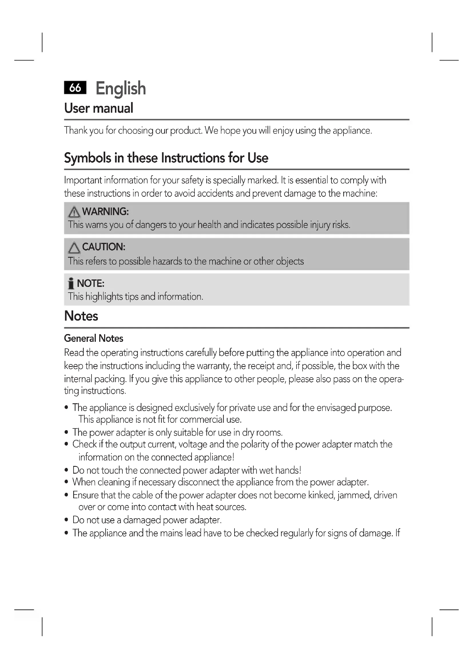 User manual Thank you for choosing our product. We hope you will enjoy using the appliance. Symbols in these Instructions for Use Important information for your safety is specially marked. It is essential to comply with these instructions in order to avoid accidents and prevent damage to the machine: