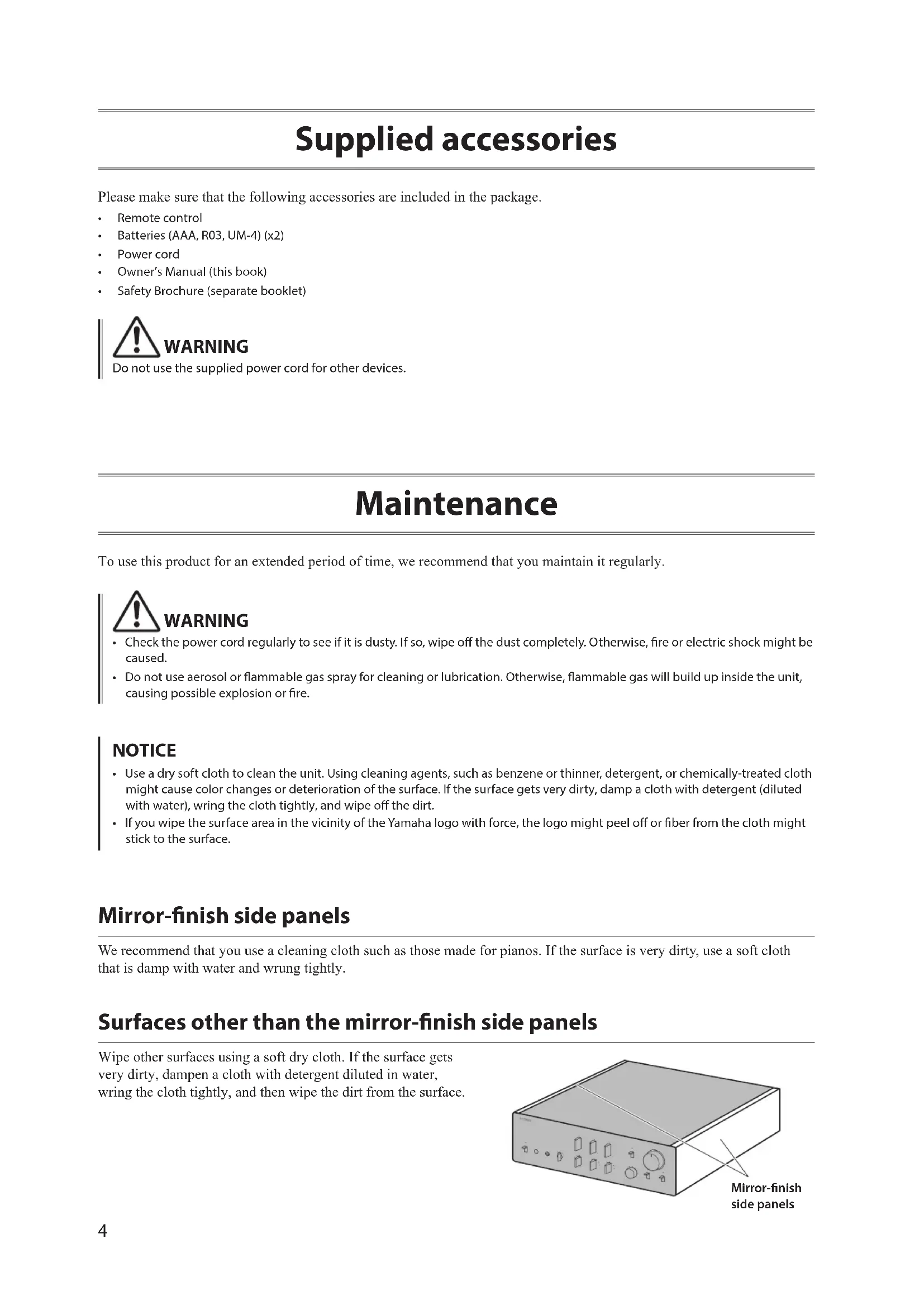 - Remote control• Batteries (AAA, R03, UM-4) (x2)• Power cord• Owner’s Manual (this book)• Safety Brochure (separate booklet) WARNING Do not use the supplied power cord for other devices. Maintenance To use this product for an extended period of time, we recommend that you maintain it regularly. WARNING
