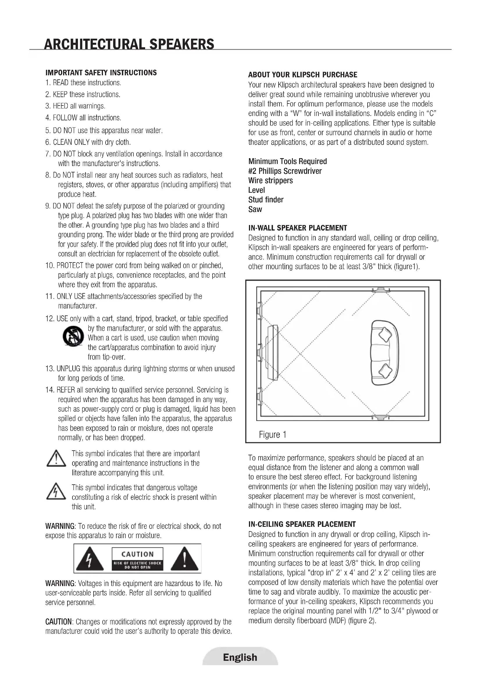 The Warranty below is valid only for sales to consumers in the United States or Canada. Figure 2 Figure 3ARCHITECTURAL SPEAKERS KLIPSCH, L.L.C. ("KLIPSCH") warrants this product to be free from defects in materials and workmanship (subject to the terms set forth below) for a period of five (5) years from the date of purchase. During the Warranty period, KLIPSCH will repair or replace (at KLIPSCH’s option) this product or any defective parts (excluding electronics and amplifiers). For products that have electronics or amplifiers, the Warranty on those parts is for a period of two (2) years from the date of purchase. To obtain Warranty service, please contact the KLIPSCH authorized dealer from which you purchased this product. If your dealer is not equipped to perform the repair of your KLIPSCH product, it can be returned, freight paid, to KLIPSCH for repair. Please call KLIPSCH at 1-800-KLIPSCH for instructions. You will need to ship this product in either its original packaging or packaging affording an equal degree of protection. Proof of purchase in the form of a bill of sale or receipted invoice, which is evidence that this product is within the Warranty period, must be presented or included to obtain Warranty service. This Warranty is invalid if (a) the factory-applied serial number has been altered or removed from this product or (b) this product was not purchased from a KLIPSCH authorized dealer. You may call 1-800-KLIPSCH to confirm that you have an unaltered serial number and/or you purchased from a KLIPSCH authorized dealer. This Warranty is only valid for the original purchaser and will automatically terminate prior to expiration if this product is sold or otherwise transferred to another party. This Warranty does not cover cosmetic damage or damage due to misuse, abuse, negligence, acts of God, accident, commercial use or modification of, or to any part of, the product. This Warranty does not cover damage due to improper operation, maintenance or installation, or attempted repair by anyone other than KLIPSCH or a KLIPSCH dealer which is authorized to do KLIPSCH warranty work. Any unauthorized repairs will void this Warranty. This Warranty does not cover product sold AS IS or WITH ALL FAULTS. REPAIRS OR REPLACEMENTS AS PROVIDED UNDER THIS WARRANTY ARE THE EXCLUSIVE REMEDY OF THE CONSUMER. KLIPSCH SHALL NOT BE LIABLE FOR ANY INCIDENTAL OR CONSEQUENTIAL DAMAGES FOR BREACH OF ANY EXPRESS OR IMPLIED WARRANTY ON THIS PRODUCT. EXCEPT TO THE EXTENT PROHIBITED BY LAW, THIS WARRANTY IS EXCLUSIVE AND IN LIEU OF ALL OTHER EXPRESS AND IMPLIED WAR- RANTIES WHATSOEVER, INCLUDING BUT NOT LIMITED TO, THE WARRANTY OF MERCHANTABILITY AND FITNESS FOR A PRACTICAL PURPOSE. Some states do not allow the exclusion or limitation of incidental or consequential damages or implied warranties so the above exclusions may not apply to you. This Warranty gives you specific legal rights, and you may have other rights, which vary from state to state.